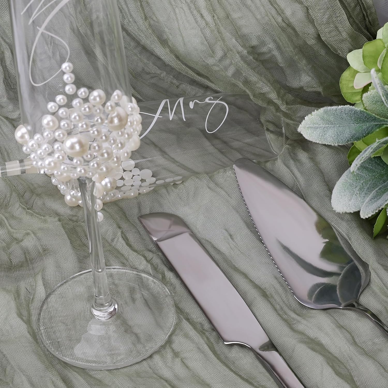 Mr and Mrs Champagne Flutes and Cake Knife Server Set, Wedding Toasting Glasses with Pearls Bride and Groom Gifts for Engagement Anniversary Bridal Shower Ceremony