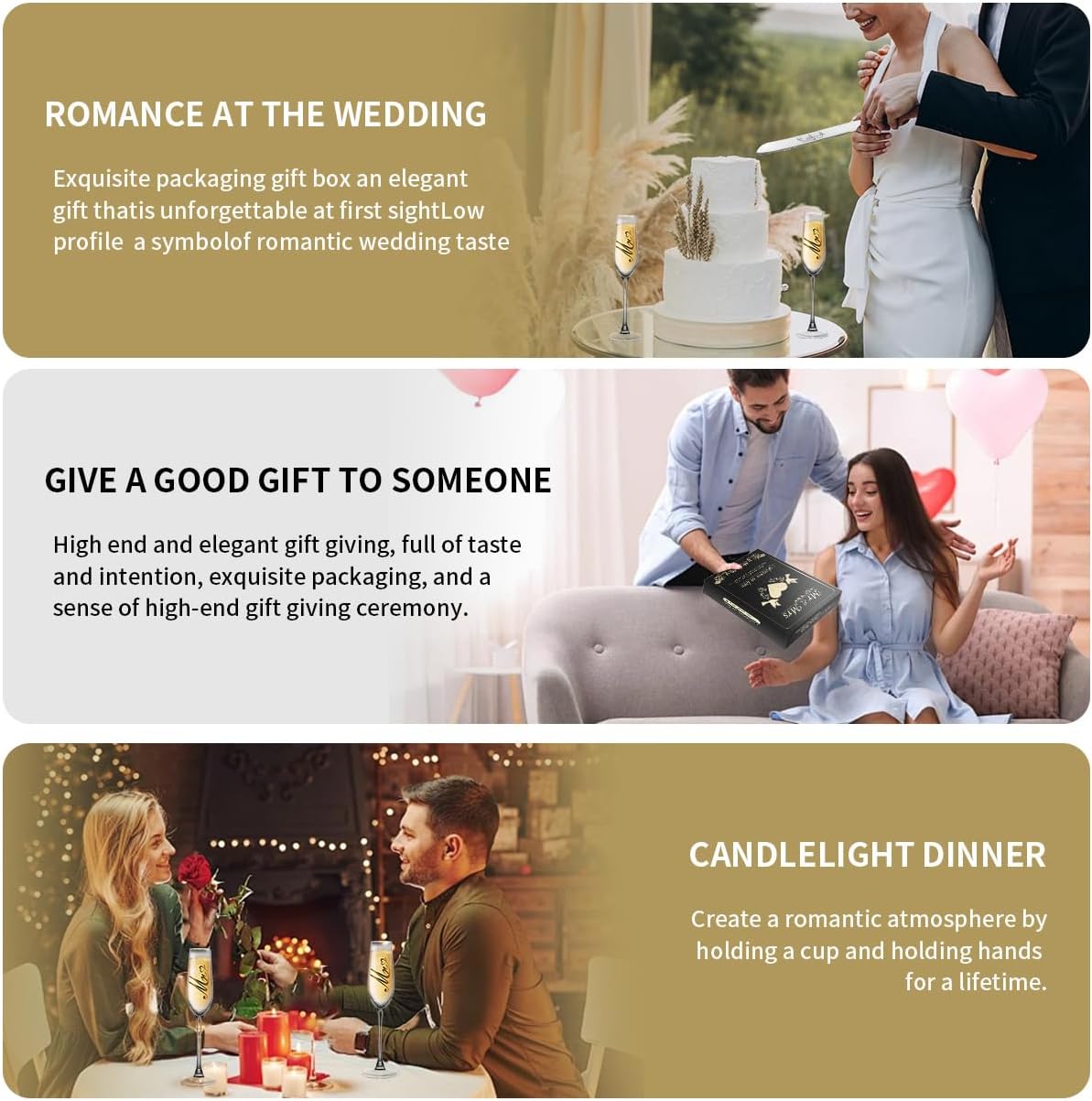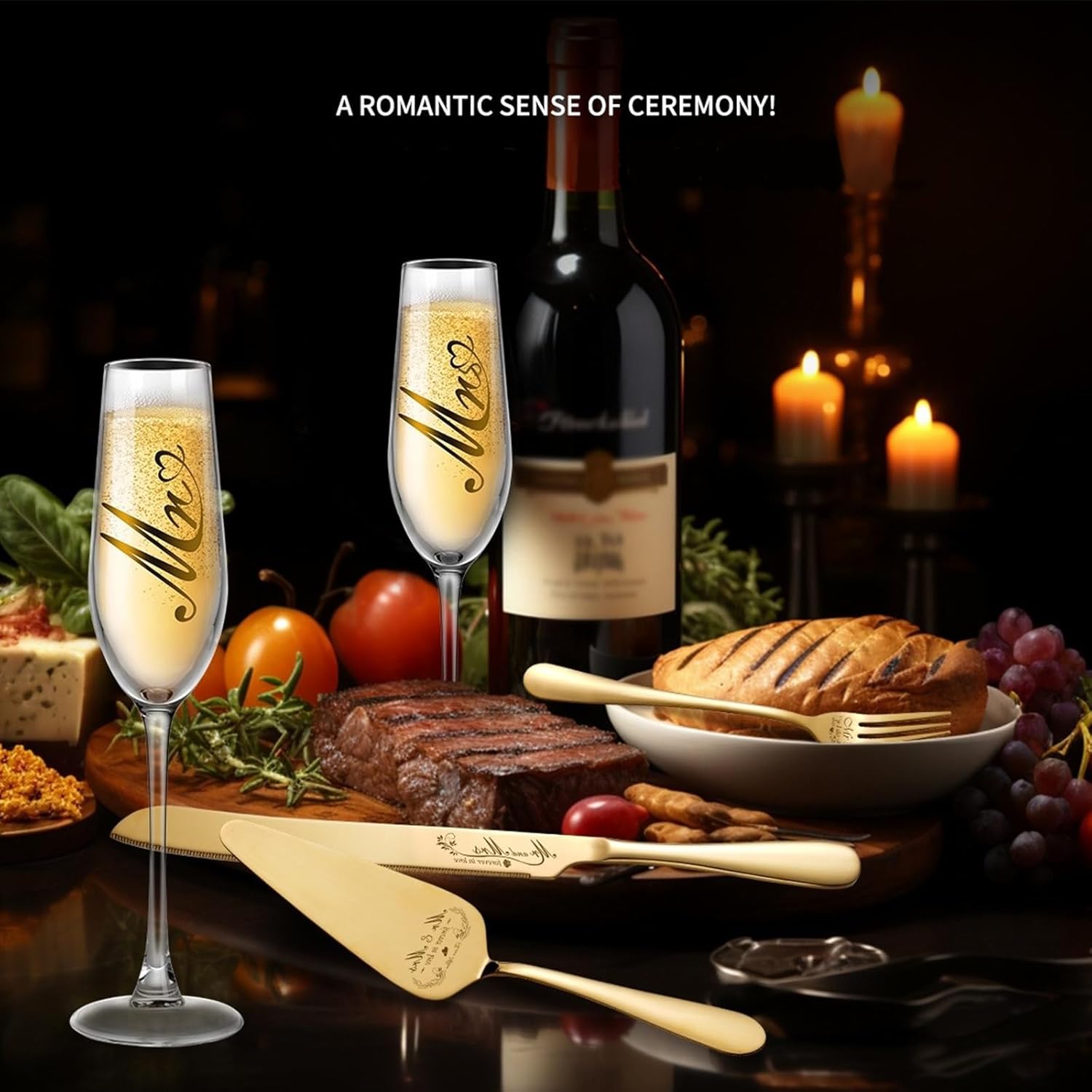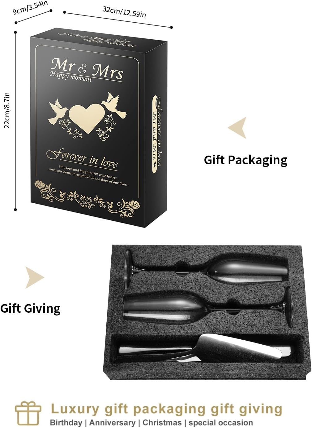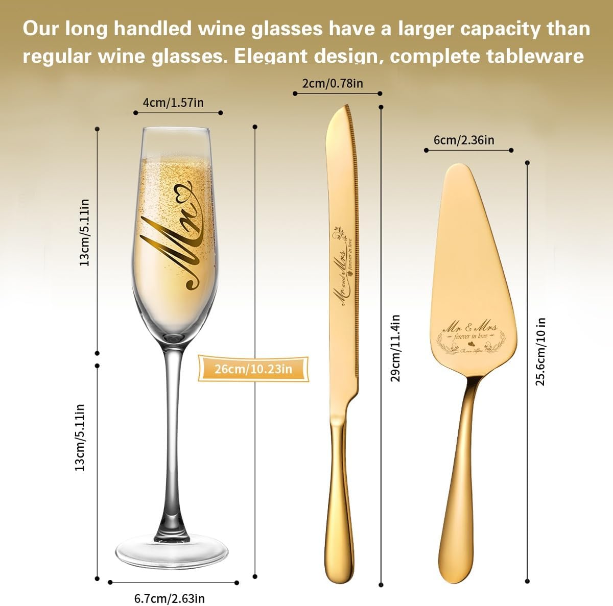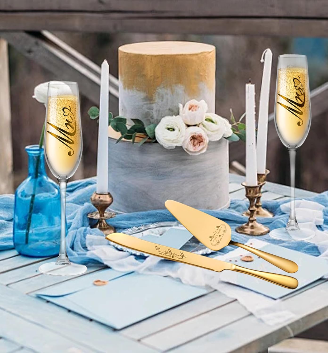 • Gifting Inspiration: The gold champagne glasses and wedding cake cutting set is the ideal wedding gift, bridal party gift and bride-to-be gift for couples. This unique gift idea will inspire your loved one to express your true feelings upon receiving the gift.