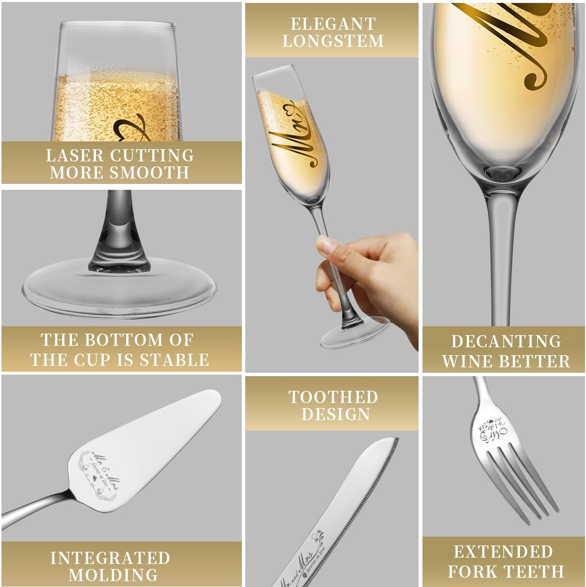 • Exquisite Design: The wedding cake knife and server set is made of high quality food grade 304 stainless steel, safe and rust proof. The set of bride and groom champagne glasses is beautifully designed with the words ‘Mr’ and ‘Mrs’ engraved on the glasses, conveying the unique emotions between the newlyweds or couples, adding a personalised and romantic touch to your wedding.