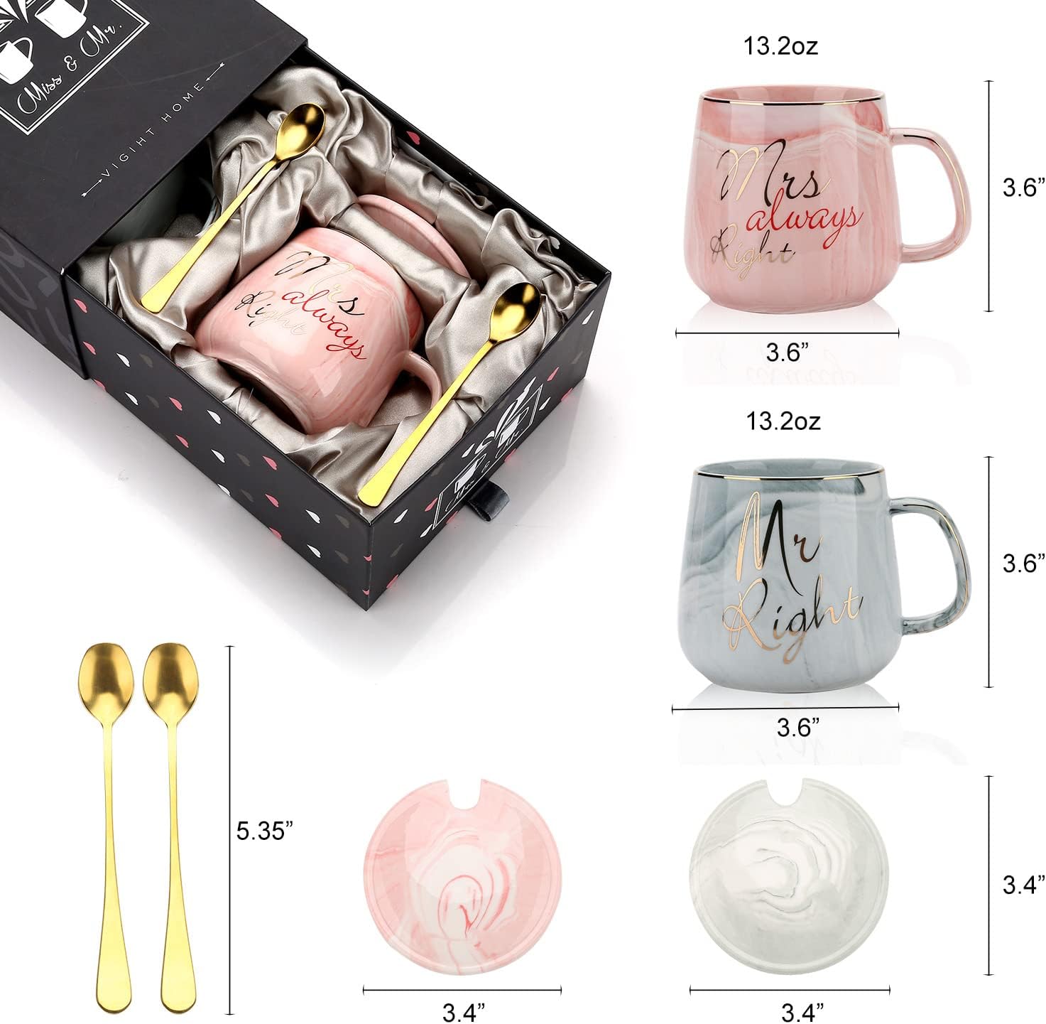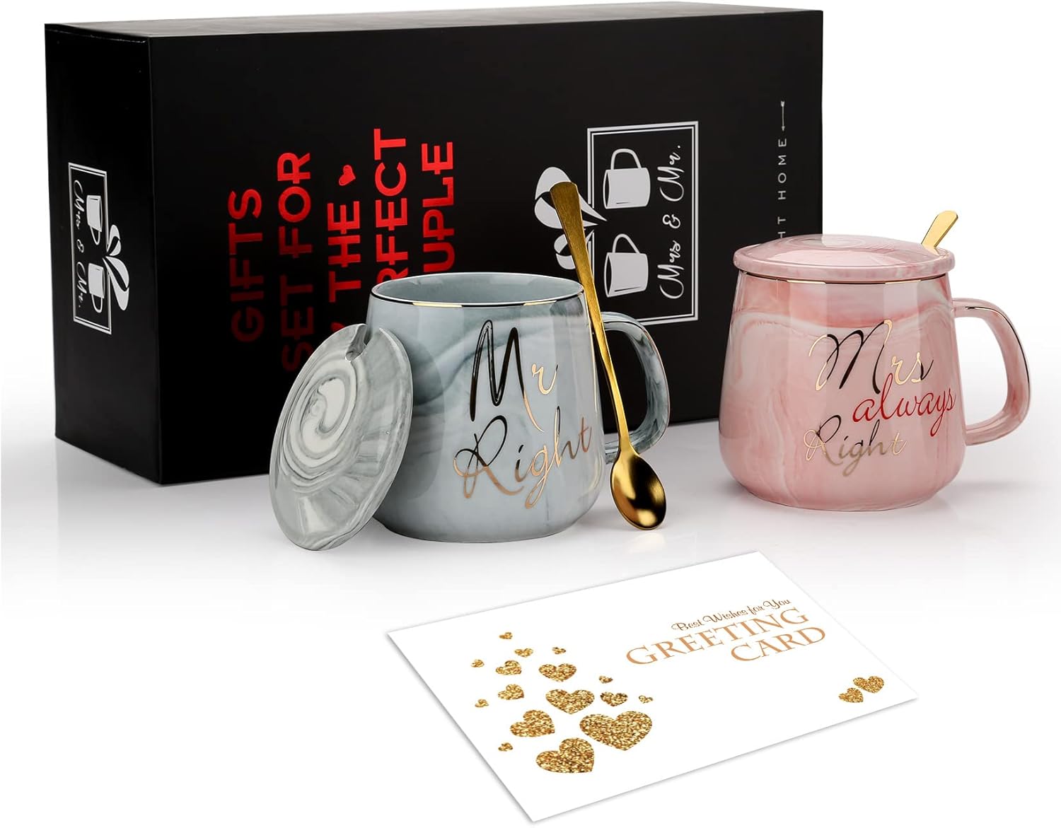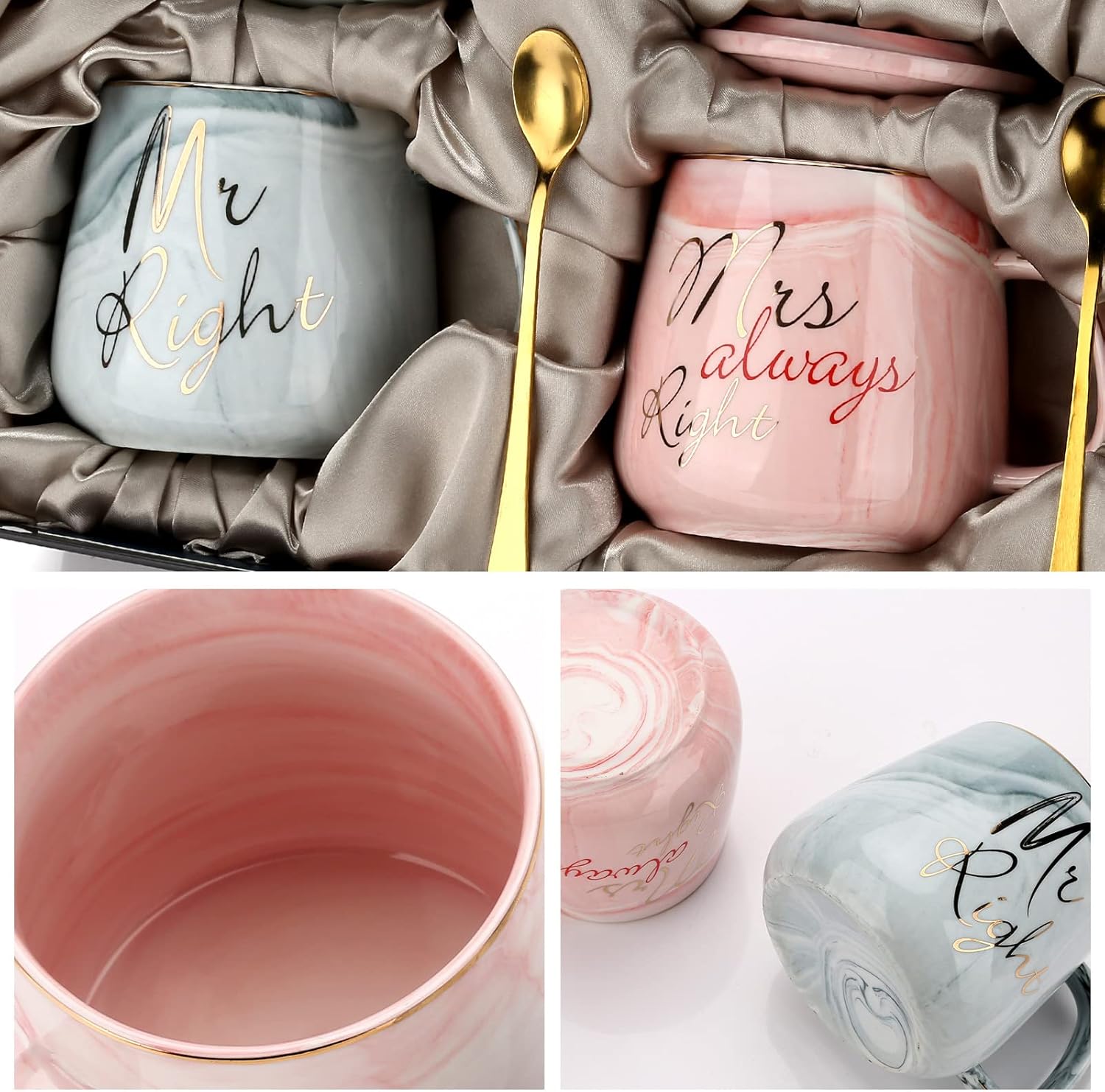 13.2 oz pink and grey ceramic marble cups, 2 Gold Spoons, Greeting Card with Pink Envelope, Pull Open Gift Box Mr and Mrs mugs, Greeting Card, Pull Open Gift Box Pink and grey ceramic marble cups, 2 Gold Spoons, Greeting Card with Pink Envelope, Pull Open Gift Box Black and White ceramic marble cups, 2 Gold Spoons, Greeting Card, Pull Open Gift Box Blue Mrs Always Right Mug with Lid, Blue Mr Right Mug with Lid, 2 Gold Spoons, Greeting Card with Pink Envelope, Pull Open Gift Box Pink and Grey ceramic marble House Warming mugs, 2 Gold Spoons, Greeting Card, Pull Open Gift Box