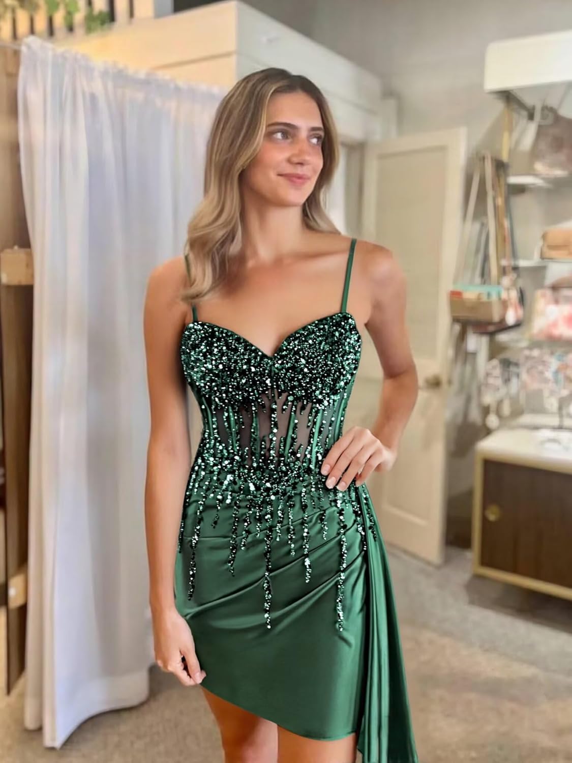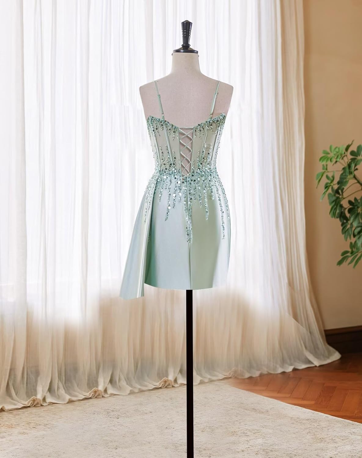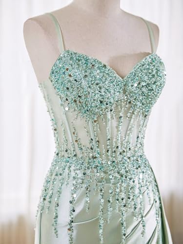 - Features:This dazzling satin prom dress is a flawless blend of elegance and allure. The fitted bodice features a sheer corset design made from sequin lace, offering both structure and sparkle. Delicate spaghetti straps frame the shoulders, while the sleek satin skirt hugs your curves and flows into a slight train. And the lace-up back ensures a perfect fit. Perfect for homecoming、graduation that call for confidence and glamour.Built in bra.
