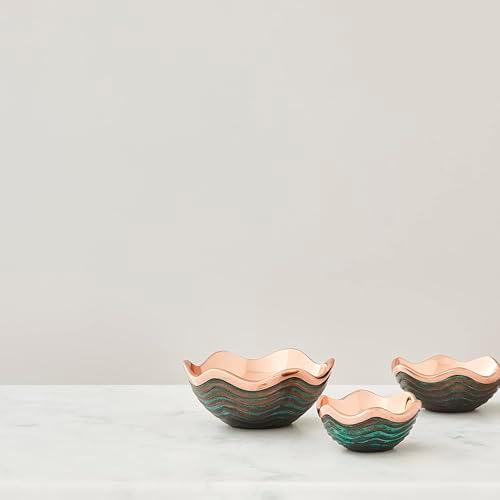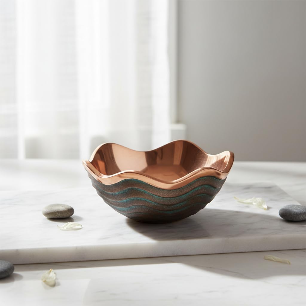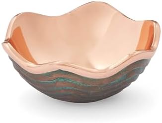 • Distinctive Sculptural Design: Created by designer Lisa Smith, this copper bowl features a scalloped rim with wave-like verdigris accents, making each piece a unique work of art.