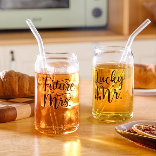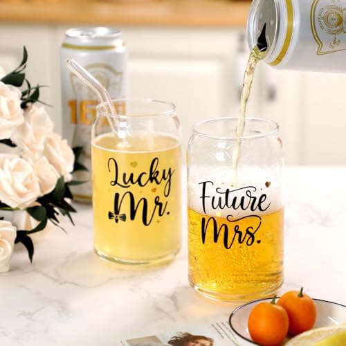Nefelibata Engagement Gifts for Couples, Future Mrs. Lucky Mr. Beer Can Glasses Set of 2, Unique Wedding Engagement Gifts for Bride Groom Her Him Women, 16oz Coffee Cocktail Drinking Cups