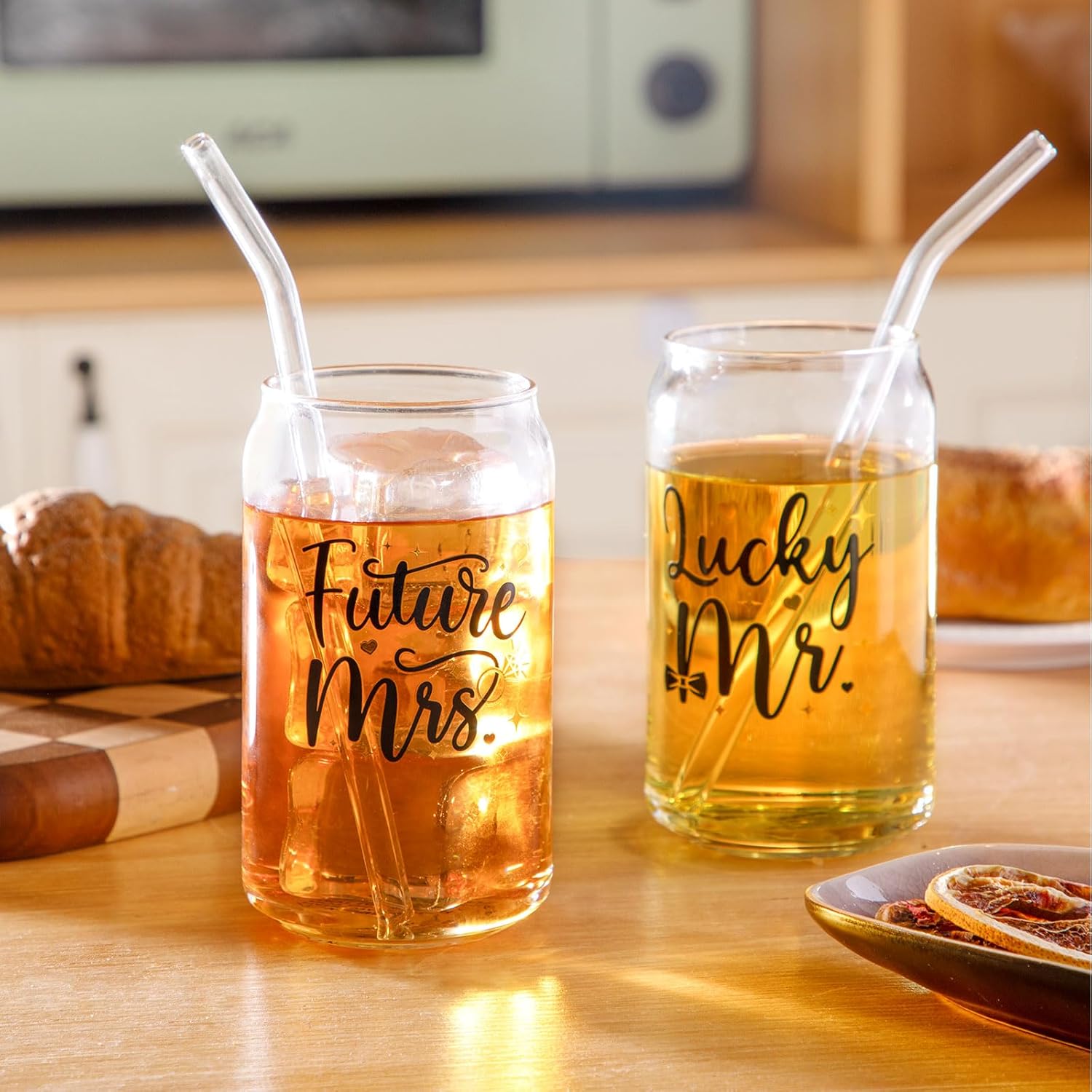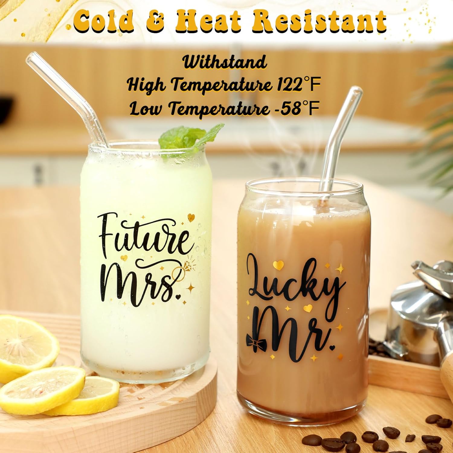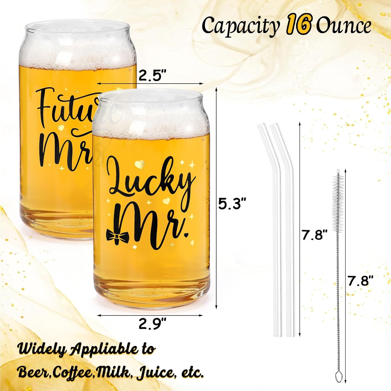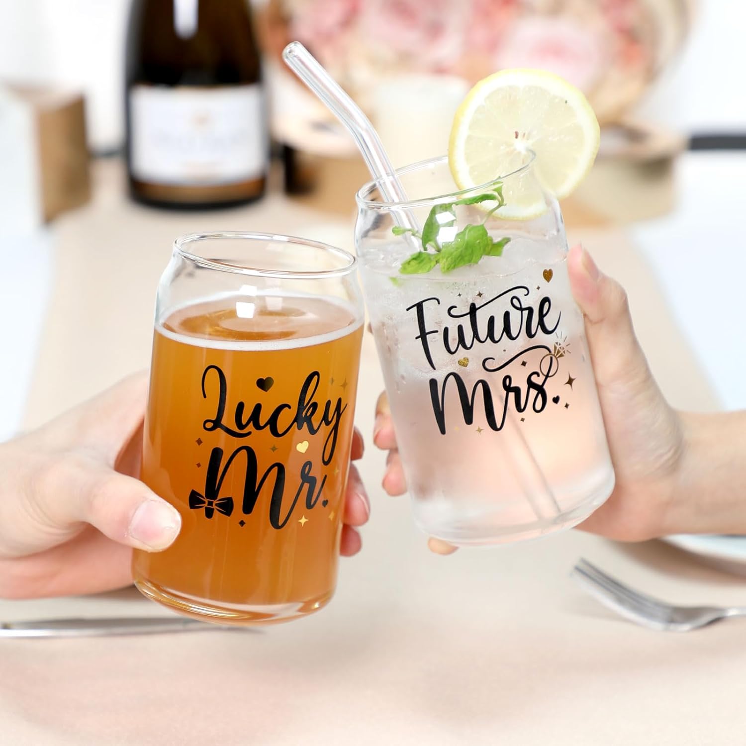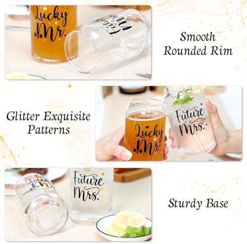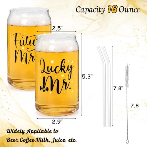• Lucky Mr. & Future Mrs. Engagement Glass Set – Package includes 2 Mr. & Mrs. themed beer can glasses, 2 glass bend straws, and 1 straw brush. It is a gorgeous proposal, engagement, or wedding planning gift for soon-to-be-married couples.