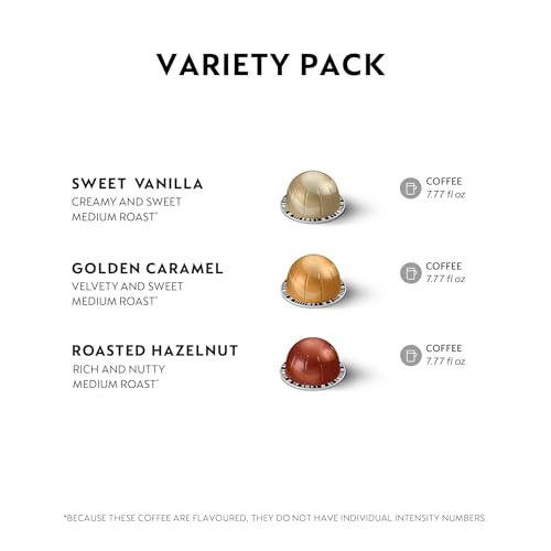 - INDULGENT FLAVORS: This assortment of Nespresso Vertuo coffee pods contains a variety of Nespresso capsules: 10 Sweet Vanilla, 10 Golden Caramel, 10 Roasted Hazelnut