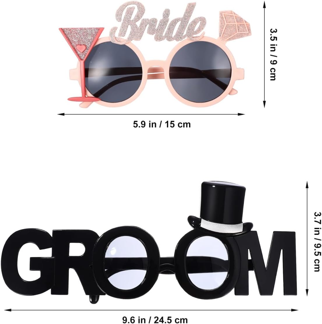 - Size: Our bridal party glasses size: 15.00X14.00X9.00cm/5.89X5.50X3.54in and other size is 24.70X14.00X9.70cm/9.71X5.50X3.81in. Our bride and groom sunglasses is a great photo prop that will turn your party into something that will never be forgotten