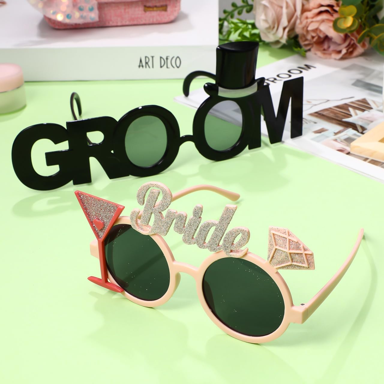 - Groom Bride Party Sunglasses: Our bride sunglasses are made of plastic material make these eyeglasses look simple charming. The two different styles are designed to show the different personalities of the two people