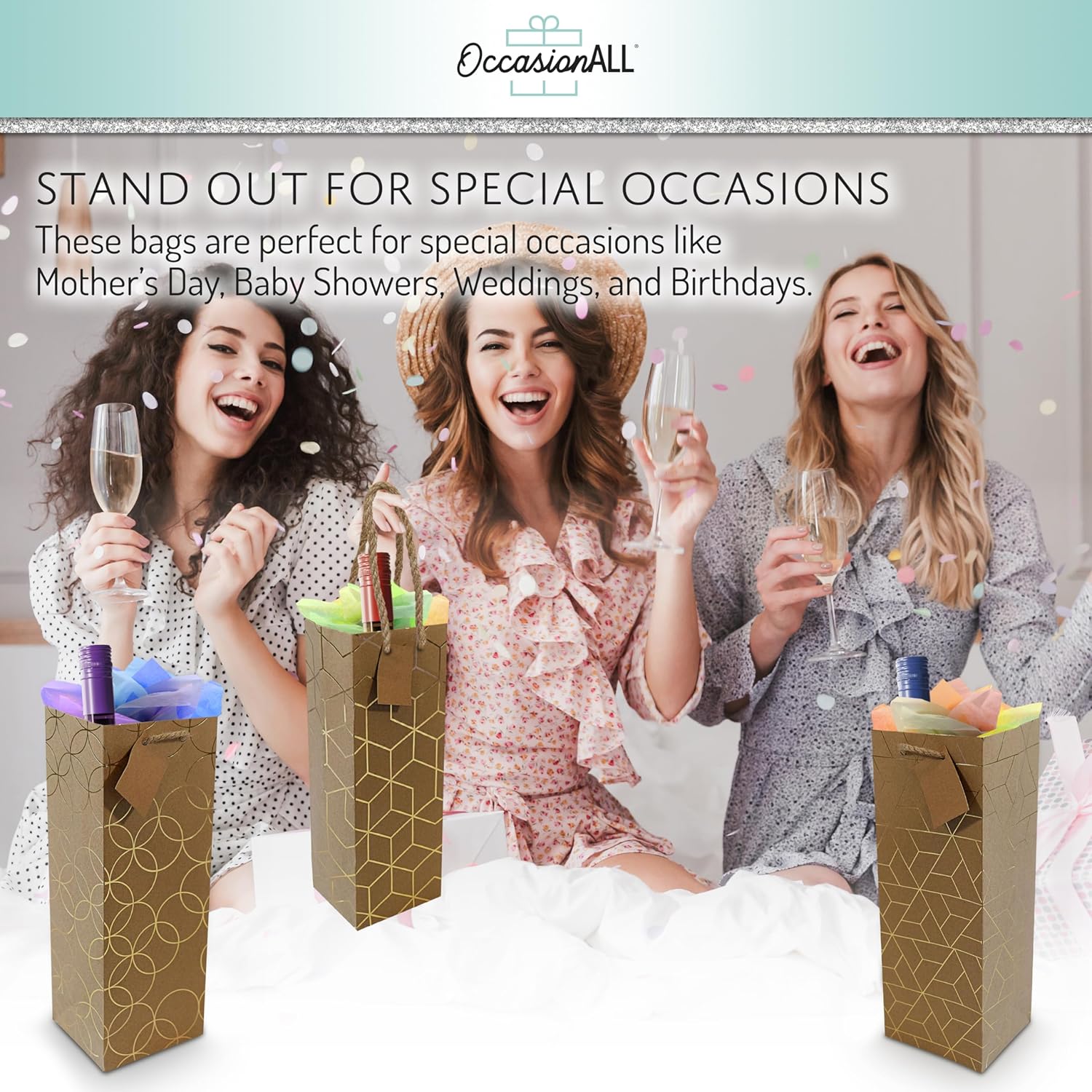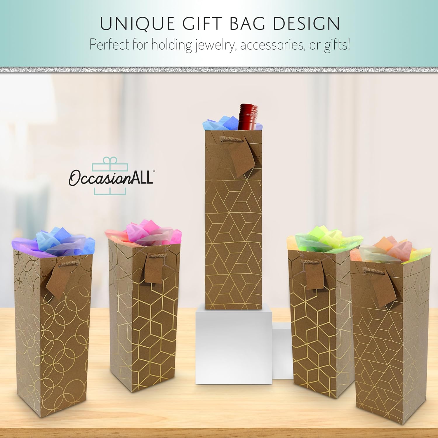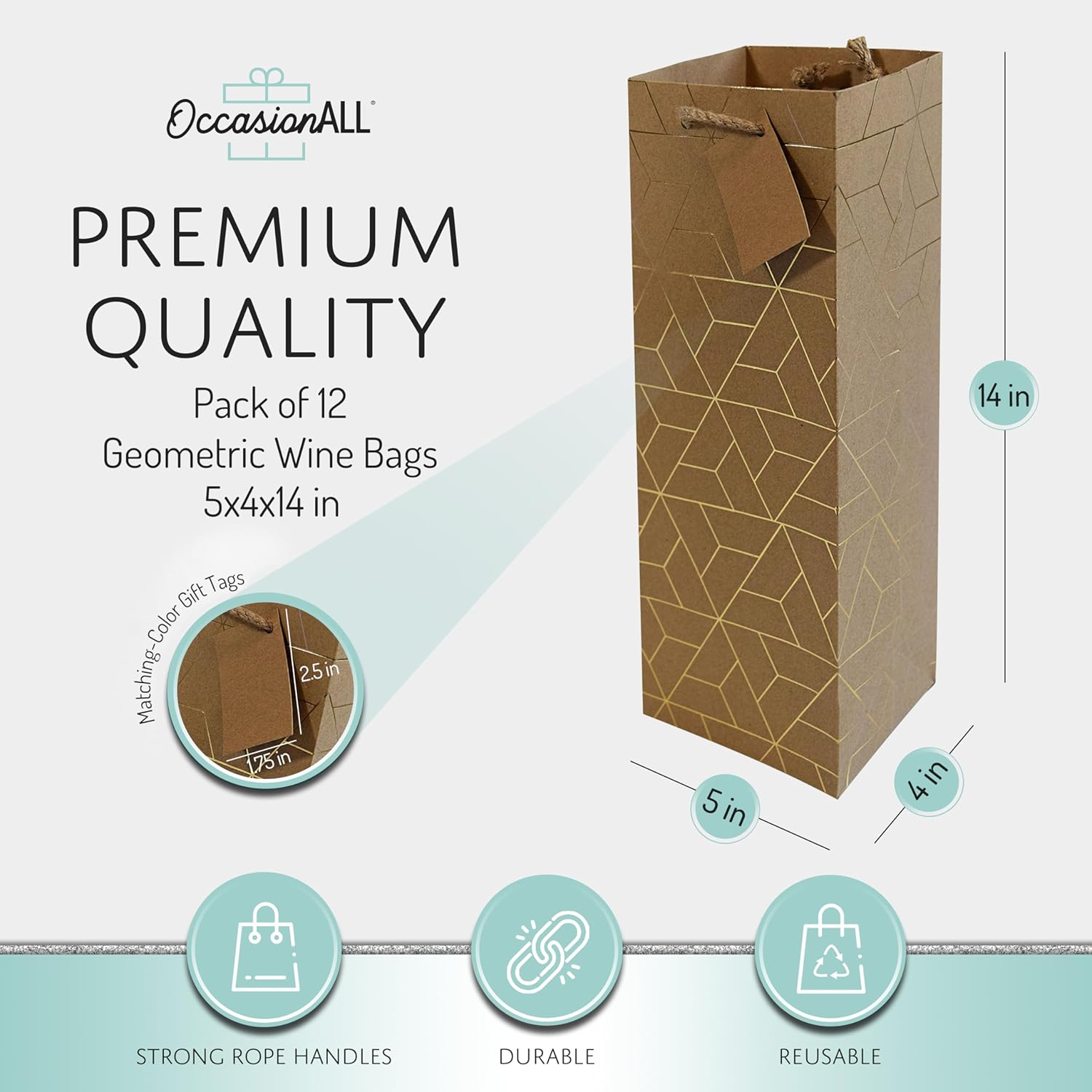 - BOTTLE-SIZED BAG – Each OccasionALL reusable geometric fabric tote measures 5” wide x 4” deep x 14” tall, designed specifically to hold wine and other bottles. Made from high-quality, eco-friendly, and reusable PP non-woven materials, these bags emit no harsh odors. The strong sewn handles provide easy and sturdy carrying for your bottles.