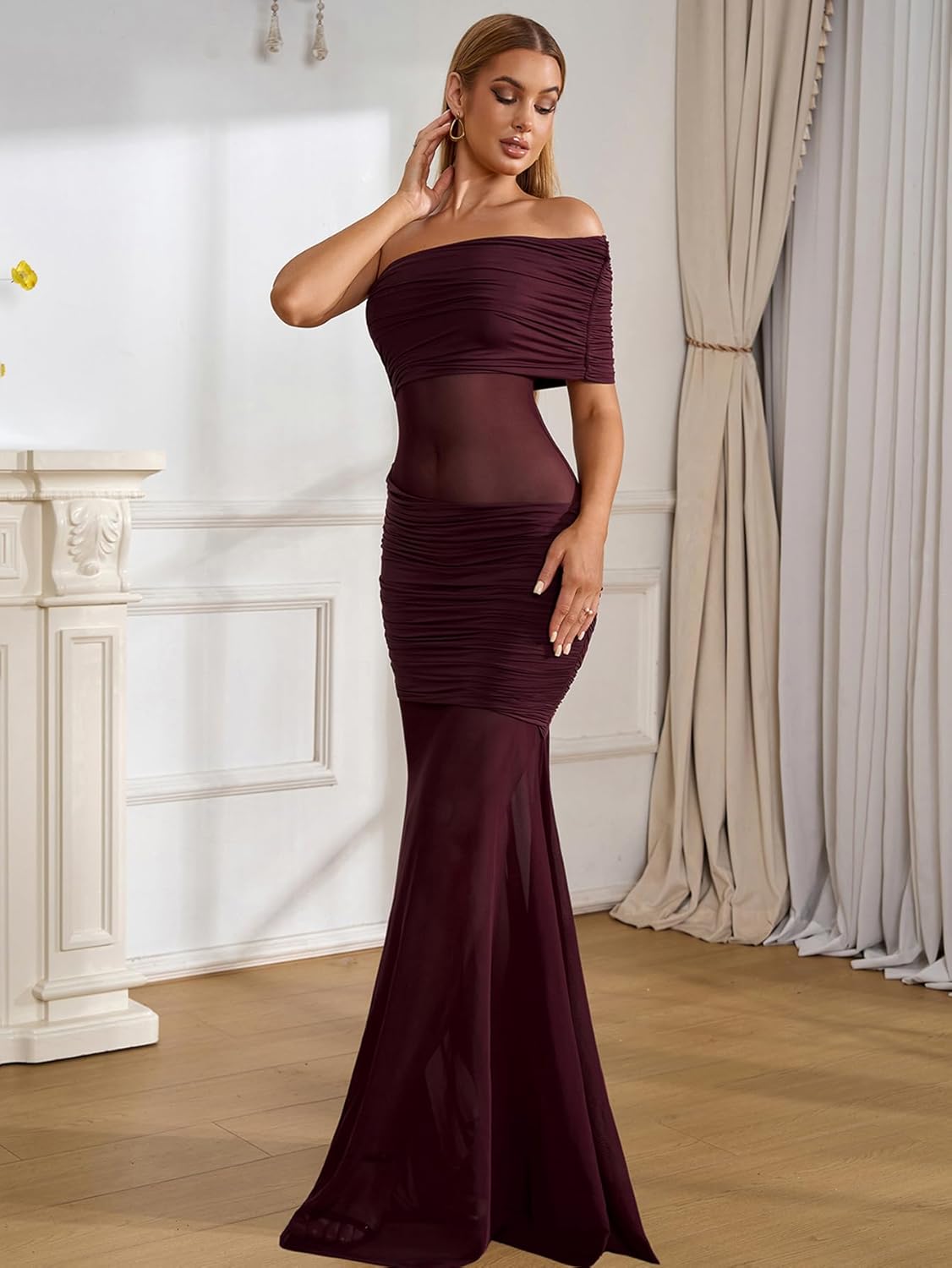 Women Sexy Off Shoulder Bodycon Mesh Splicing See-Through Ruched Long Dress wedding guest dress formalwedding guest dress formal