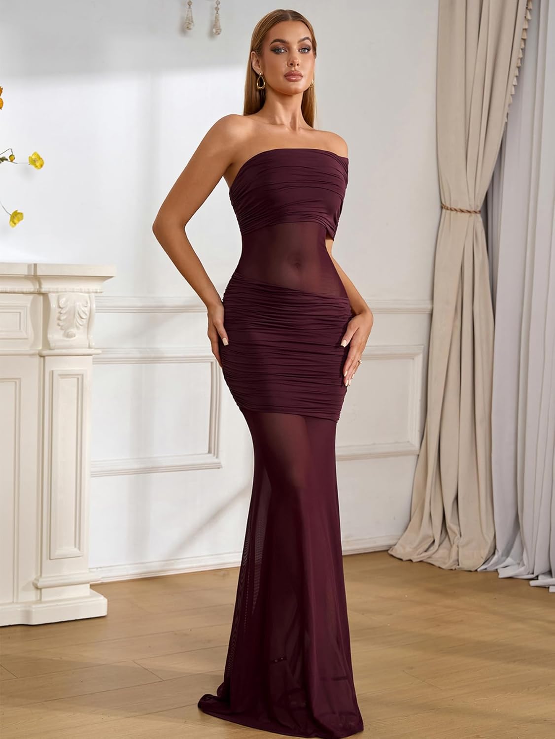 • Feature:Elegant bodycon evening party dress, off shoulder styling, backless, ruched asymmetrical, sexy see through, solid color, floor length mesh dresses for women. This chic corset dress hugs your curves from a fitted waist down to a maxi hem with soft fabric