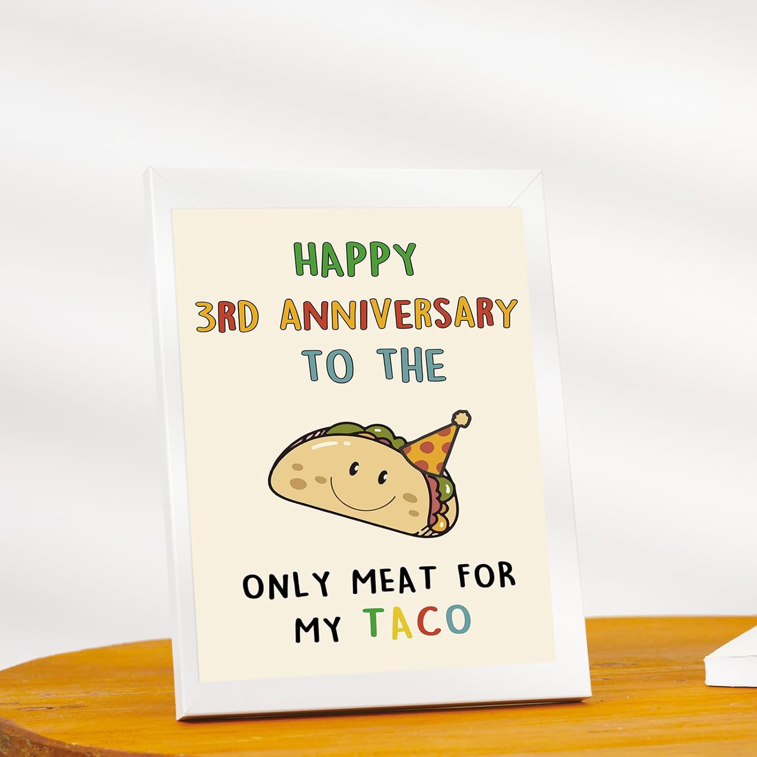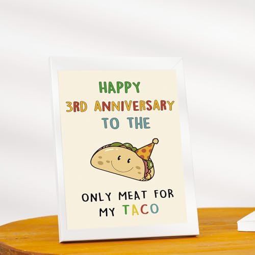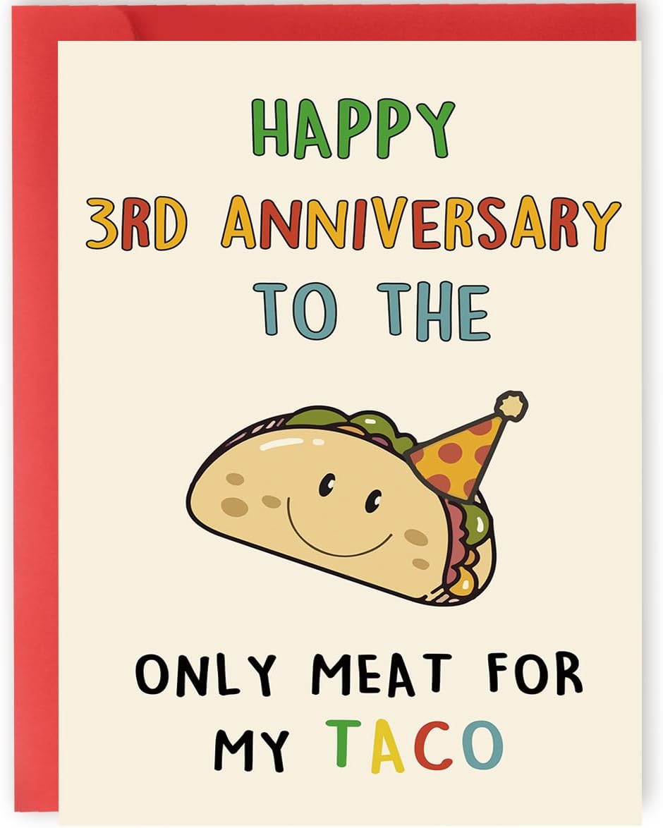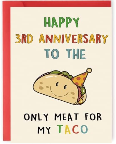 Celebrate your third anniversary in style with this charming ‘Happy 3rd Taco Anniversary’ card from OJsensai. This modern, food-themed greeting card is perfect for adults, featuring a unique taco design on solid red cardstock. Measuring 8 x 5.3 inches, it’s printed on luxury 300gsm linen cardstock for a premium feel. The inside is blank, allowing you to personalize it with your own message or drawing. Ideal for husbands, boyfriends, or fiances, it also doubles as a fun photo prop or party decoration.