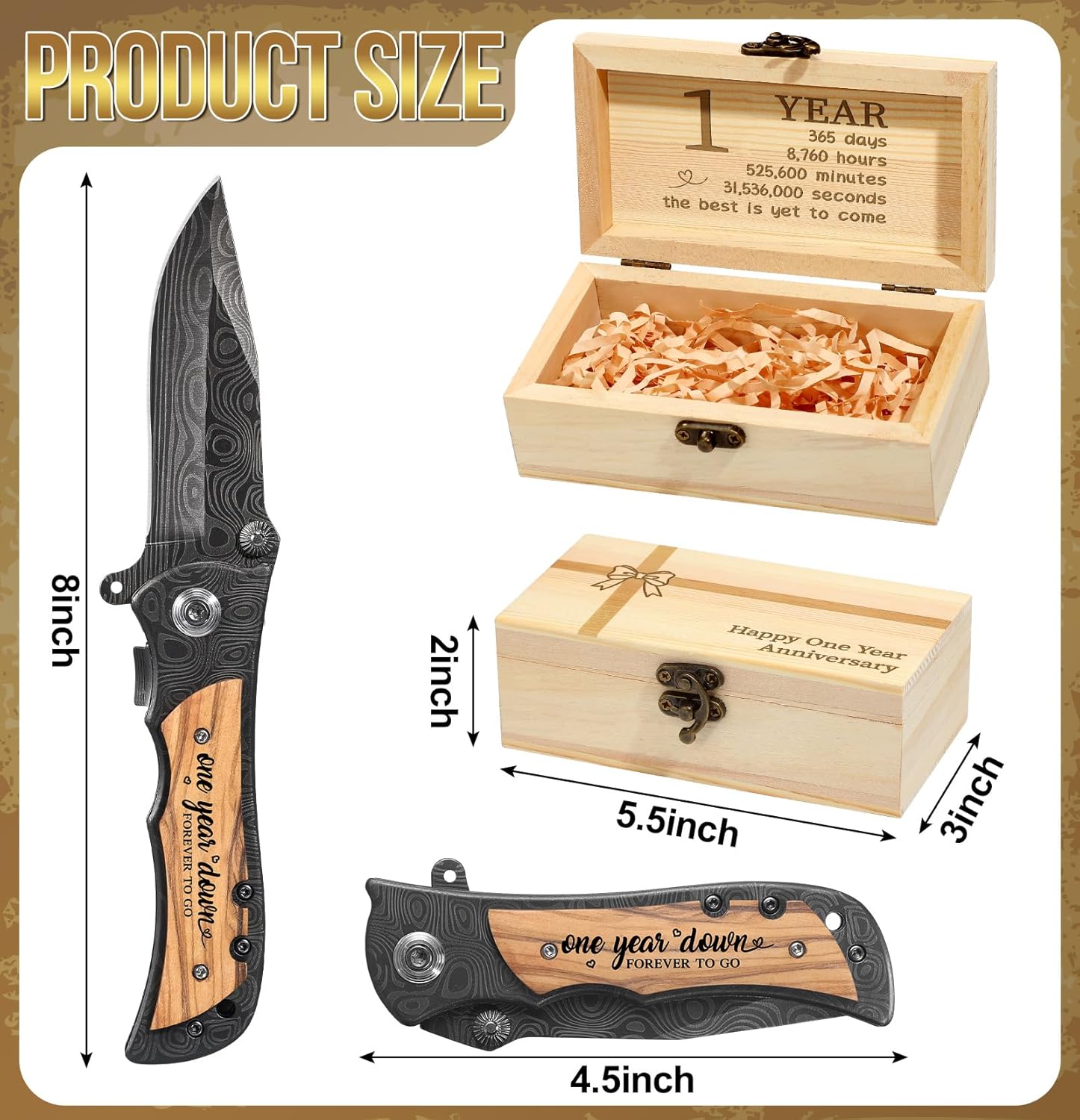 - One Year Wedding Anniversary Gift: you will receive a lockable wooden box padded with raffia and containing an olive wood handled Damascus grain folding knife, this one year tin anniversary gift is beautifully packaged in a gift box and can be given as a gift straight away