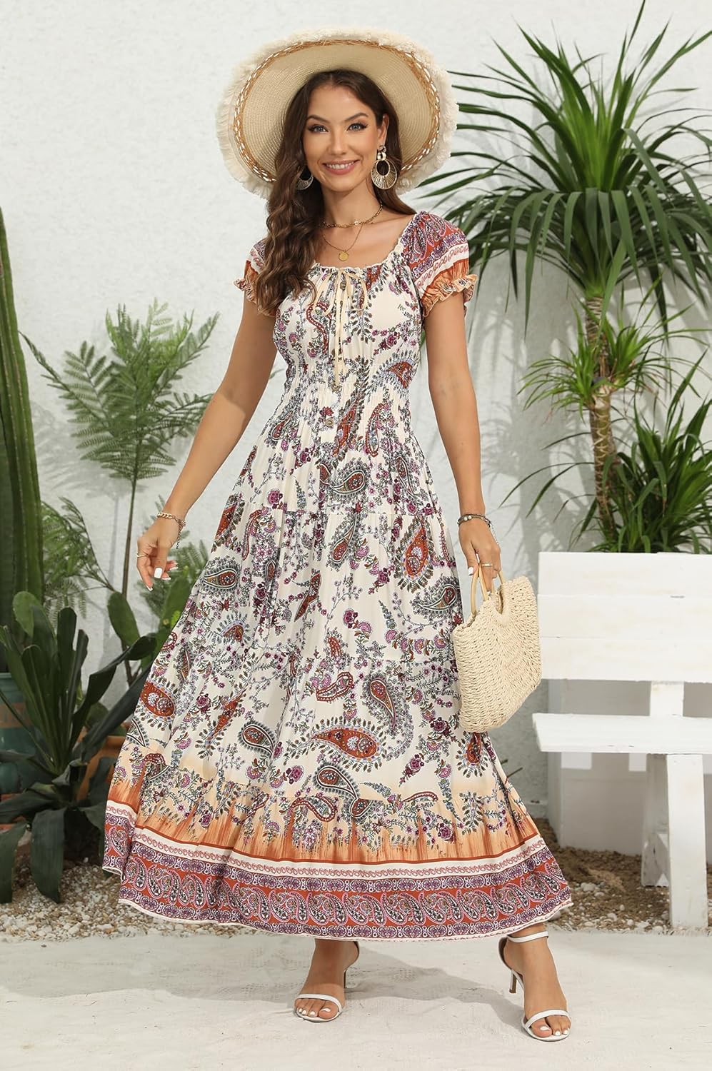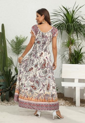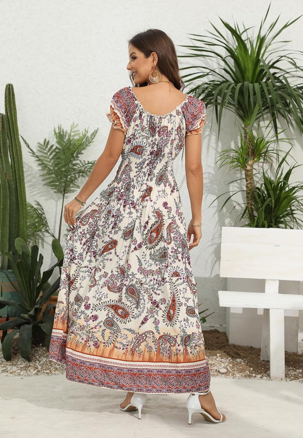 - Bohomian Maxi Dress Design – Short ruffle sleeve hole and collar with buttons decorating on the central front, A-line style with flowy hem, as a boho beach dress for your vacation and daily wearing
