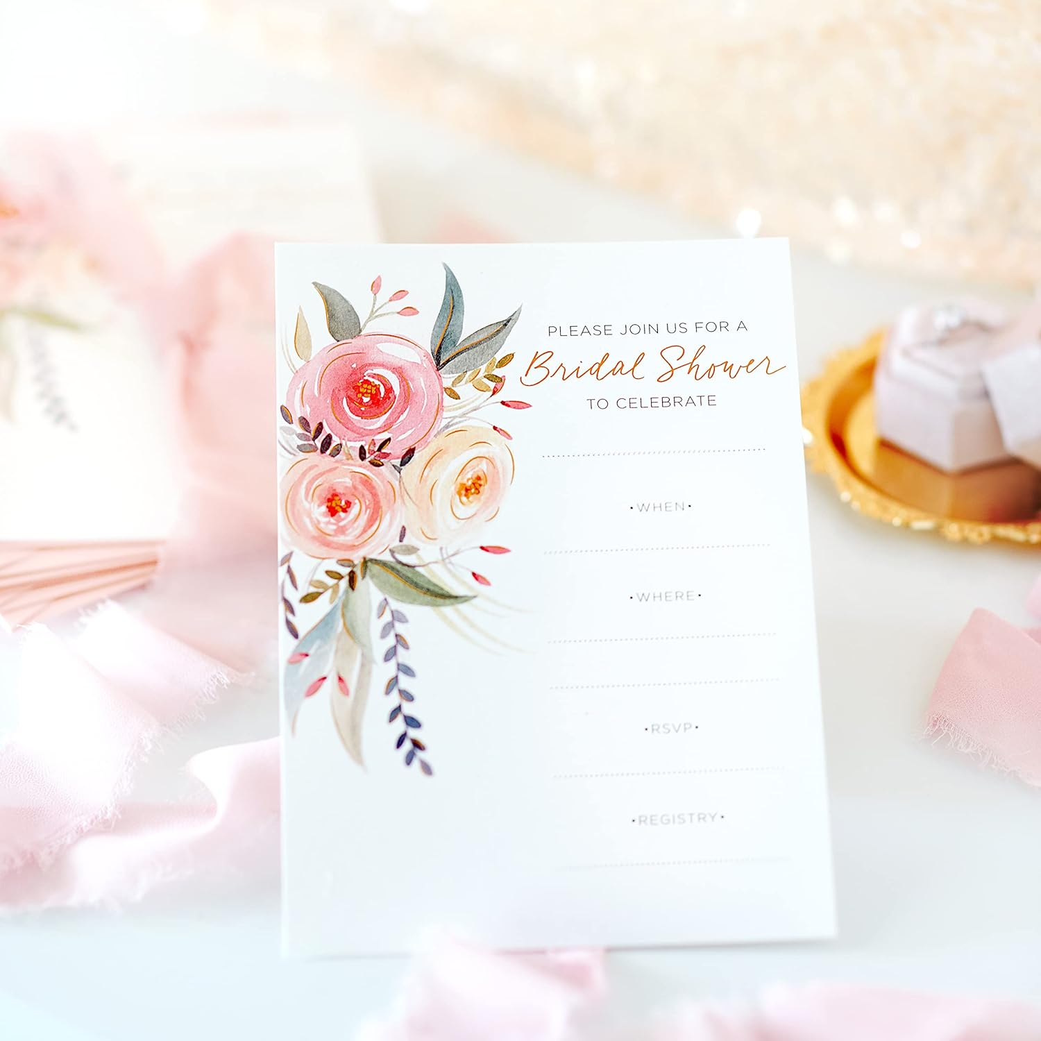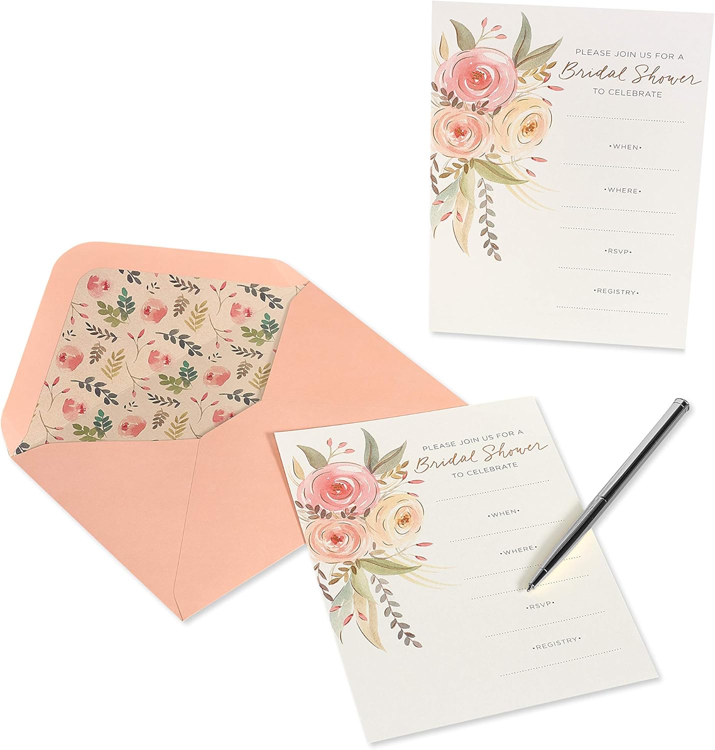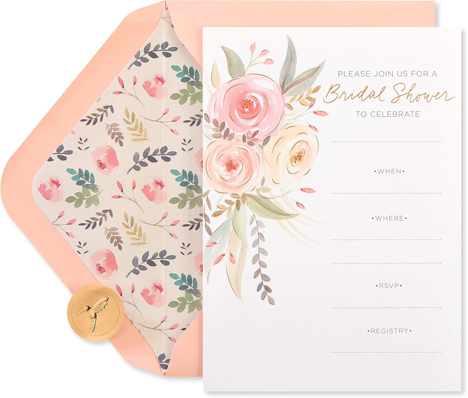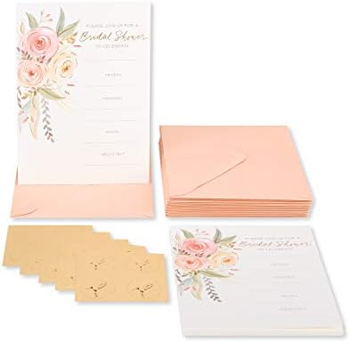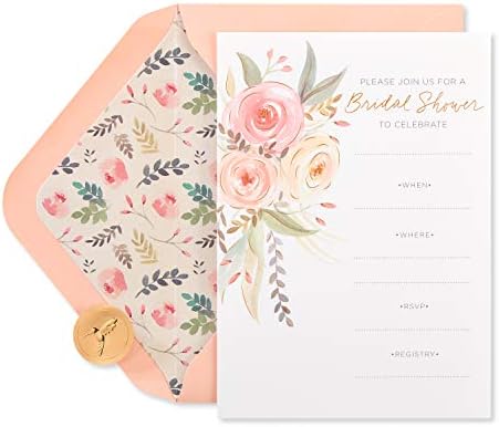 Here comes the bride! Get ready to celebrate the big day with this set of 20 beautiful bridal shower fill-in invitations exclusively from Papyrus. These pretty coral colored invitations feature a beautiful floral illustration as well as metallic foil accents. The cards are blank so theres plenty of room to write personalized messages for every guest. They also come with a matching set of 20 coral envelopes with floral linings and 20 gold foil Papyrus seals.