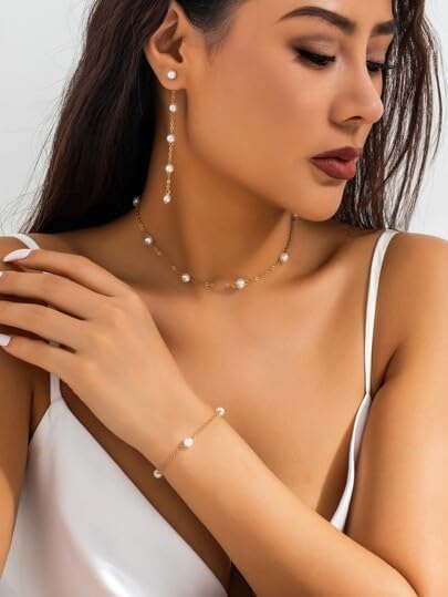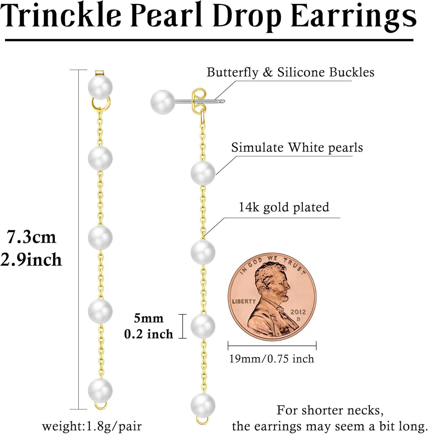 - Long Pearl Chain Earrings: Our pearl earrings feature simulated pearls (not real pearls), offering affordable elegance with a lustrous, full-bodied appearance. Each graduation pearl earrings long is 2.9 in (7.3 cm), pearl calibre is 0.2 in (0.5 cm), 1.8 g/pair weight. Shorter necks may prefer shorter styles. Crafted with simulate white pearls and 14K gold-plated material, each simulated pearl is round and full. These pearl earrings dangle are nickel and lead-free, making them suitable for any sensitive ears.