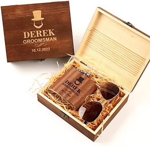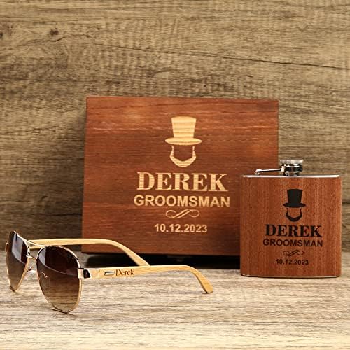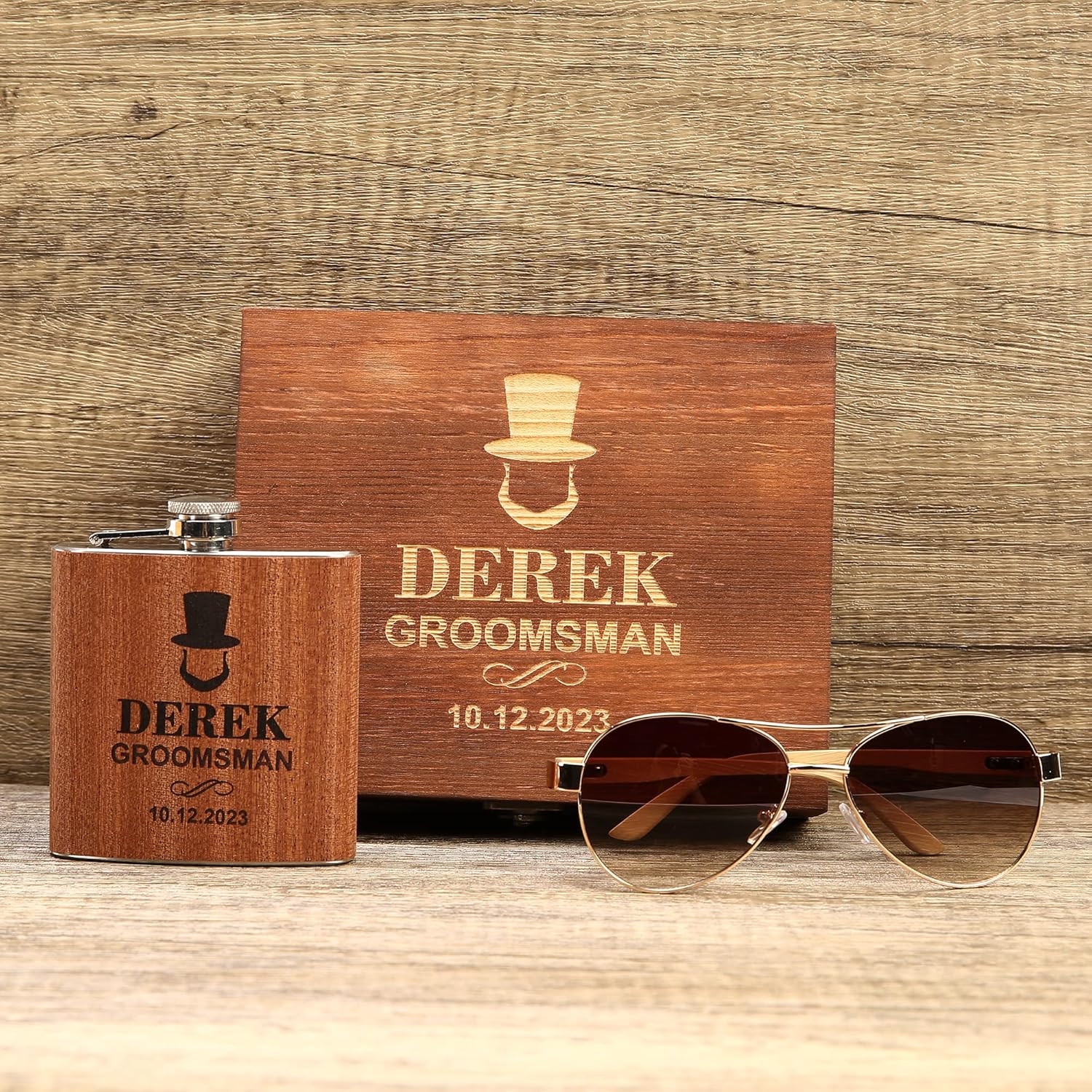 Personalized Flask Set, Mens Gifts, Engraved Flask & Wooden Sunglasses Gift Set, Groomsmen Gifts