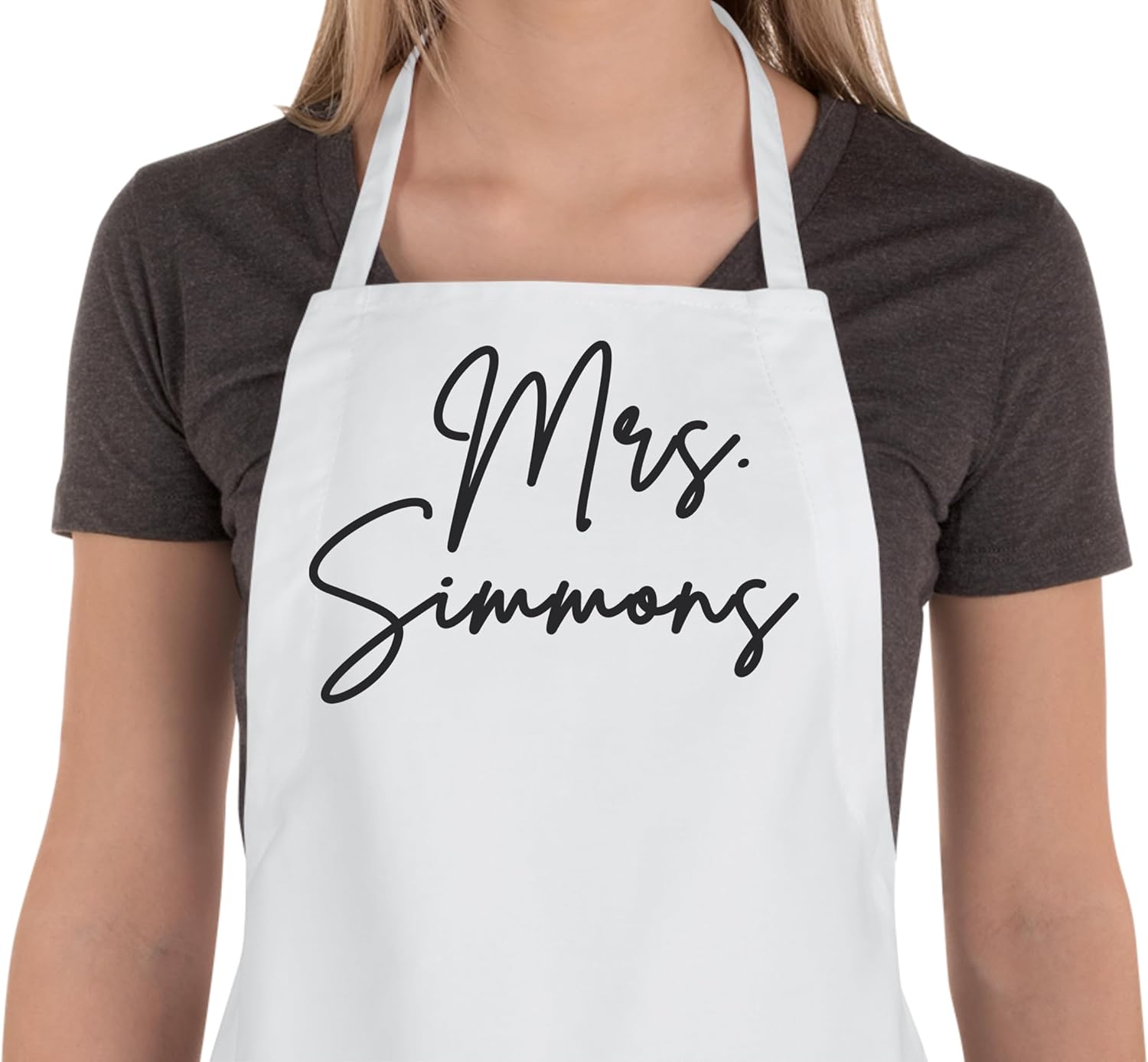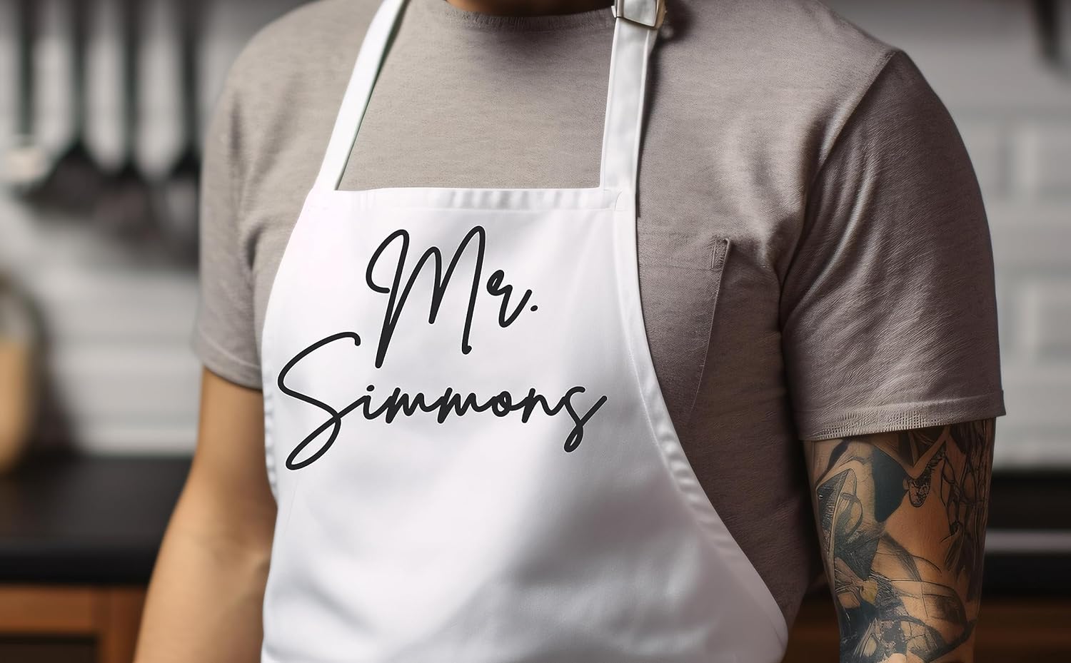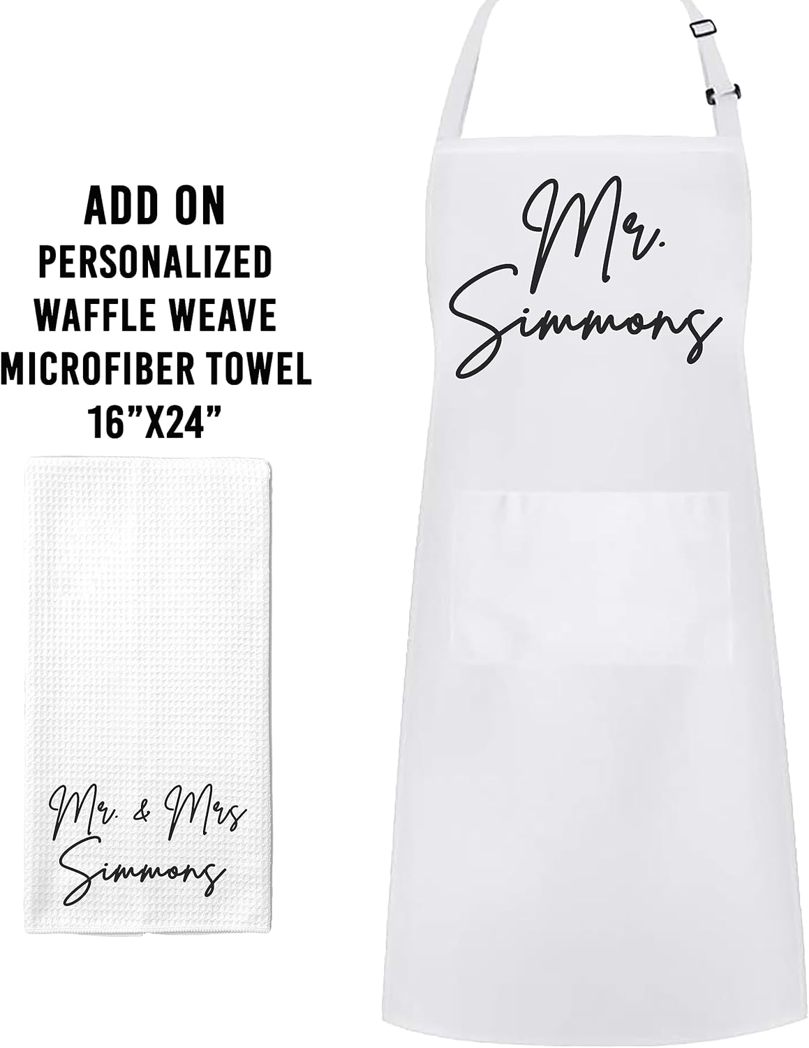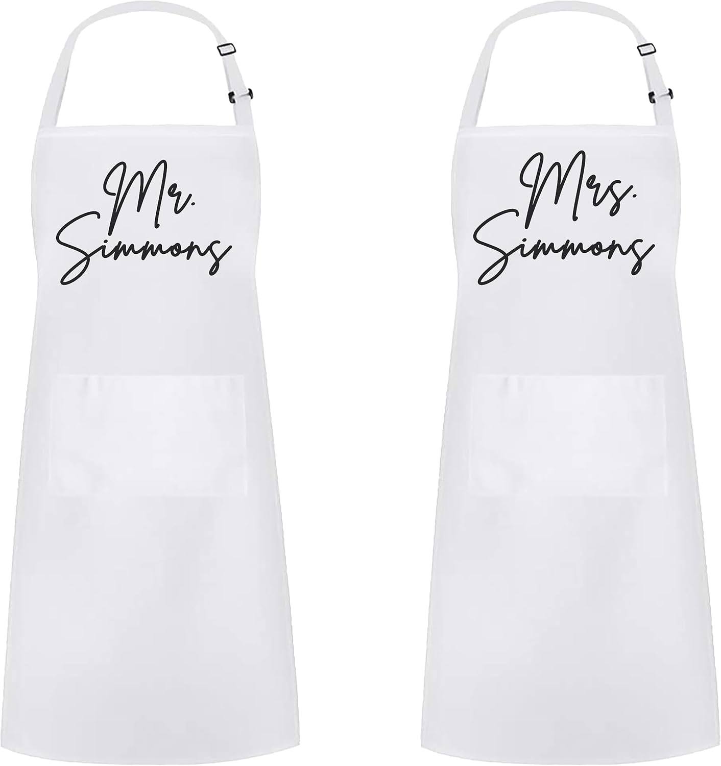Our Couples Aprons are personalized with the newly weds last name. These aprons make the perfect gift for those who love to cook! With two spacious pockets and an adjustable neck strap, this apron is designed to make your time spent baking comfortable and enjoyable. The water resistant fabric ensures that any spills can easily be wiped away, while the custom saying and name will add a special touch to your baking attire. Completely customize your Name and Saying