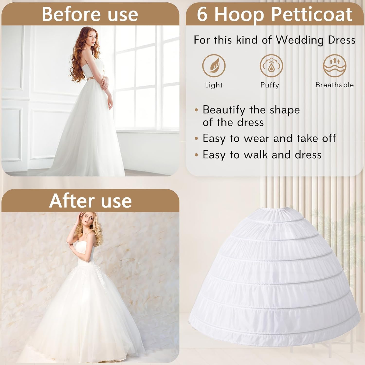 • Hoop Skirt with Full Shape & Fluff — The petticoat skirt has 6 strong hoops to give your dress fluffy and full shape. Designed to be worn underneath your dress, the hoop skirt petticoat adds instant fluff and keeps shape steady while you to walk, sit, and twirl with ease—all eyes will be on you.