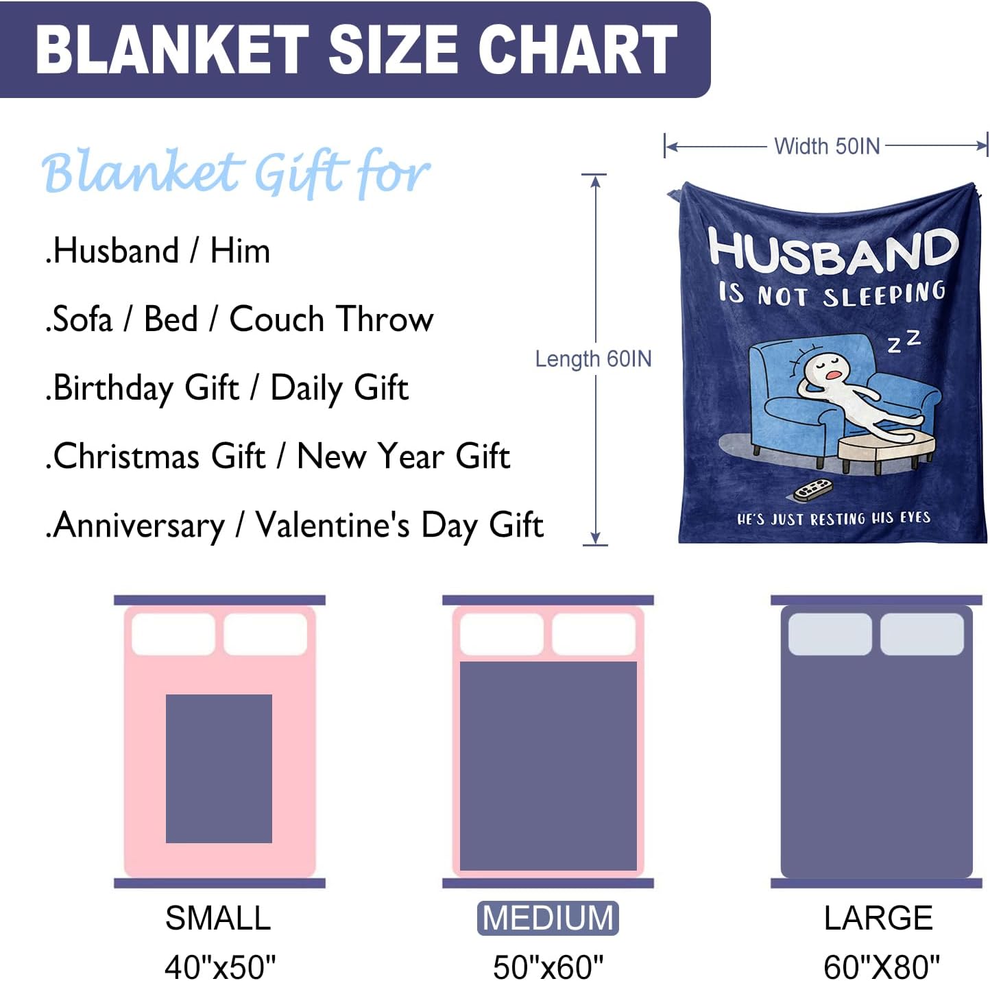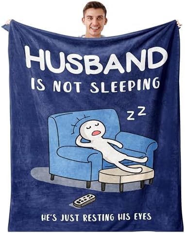 - 【Best Gift Idea for Husband】This funny husband-theme blanket is the perfect gift for your dearest husband, the blanket is printed with “Husband is Not Sleeping He’s Just Resting His Eyes”, the copy is funny and humorous, the unique print and color design are impressive, and it is very suitable as a husband birthday gift, gifts for men him husband, birthday gifts for men husband, anniversary gifts for men husband, gifts for husband, husband gifts, birthday gifts for husband, cool anniversary gifts for husband from wife, wedding anniversary gifts for husband.