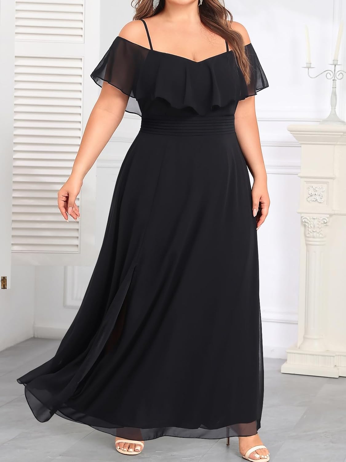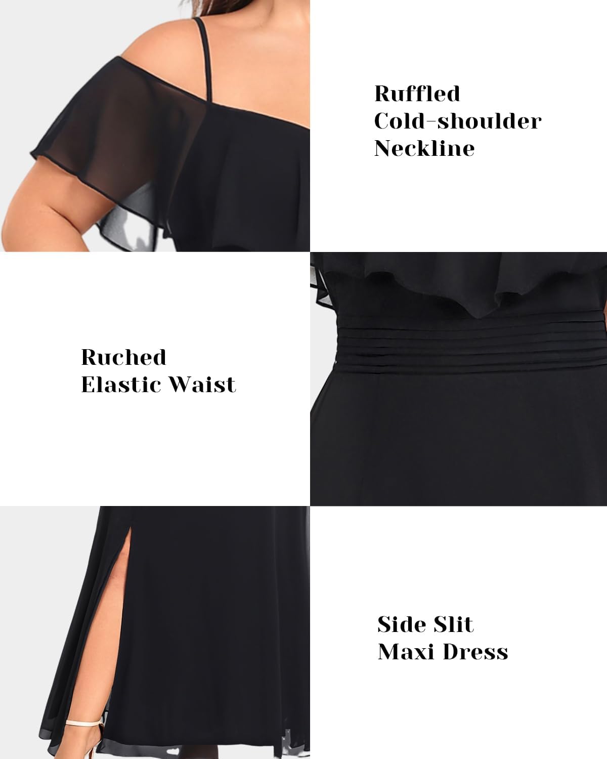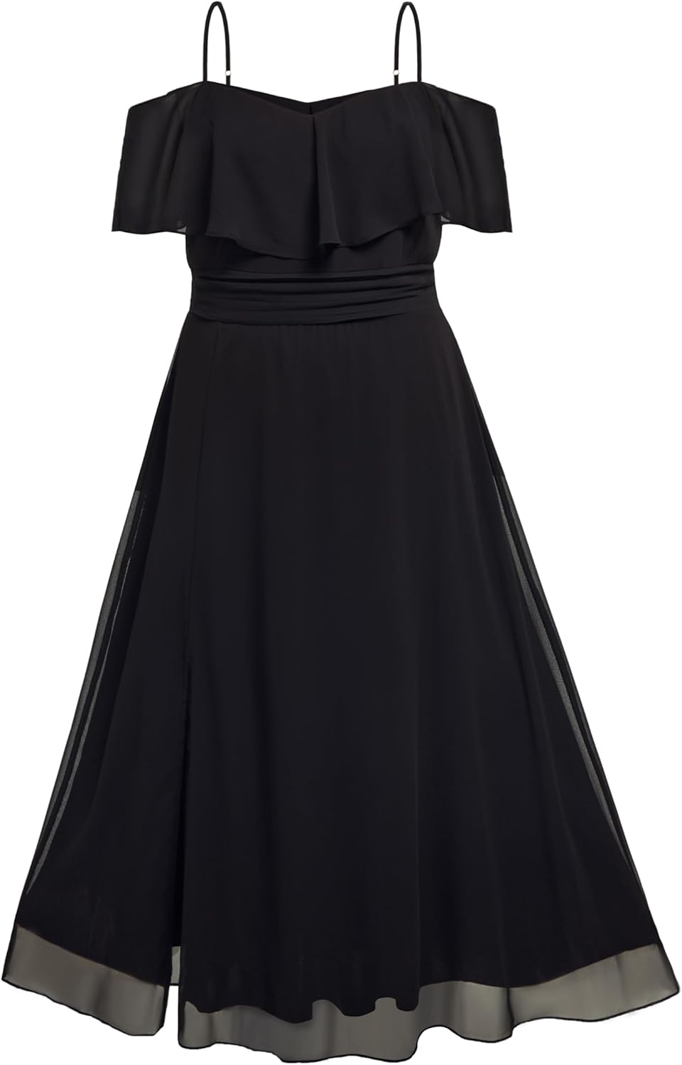 - Features: The black formal dress features a ruffled cold-shoulder neckline, spaghetti straps, a shirred waist, a side slit, a chiffon tulle, and a-line silhouette.