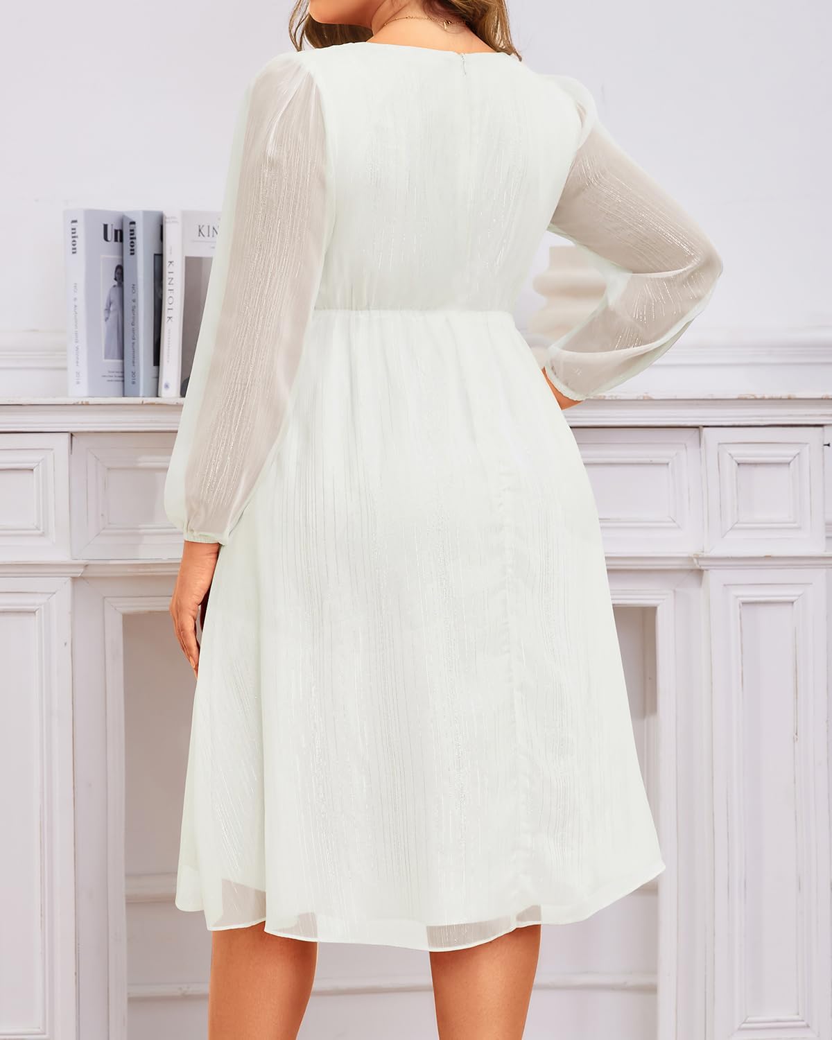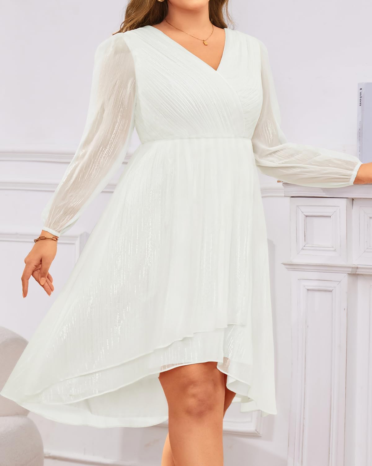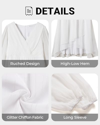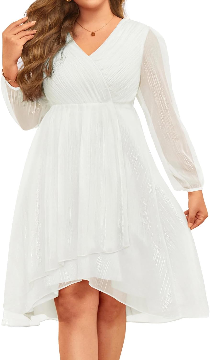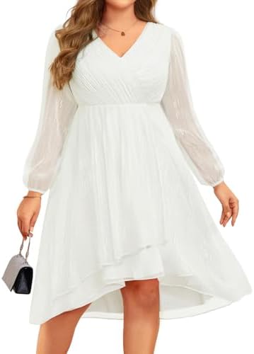 - Features: This plus-size midi formal dress for curvy women features a V-neck, long sleeves, an empire waist, tea length, an A-line hem, and an elegant high-low hem, making it wearable in fall, winter, and spring
