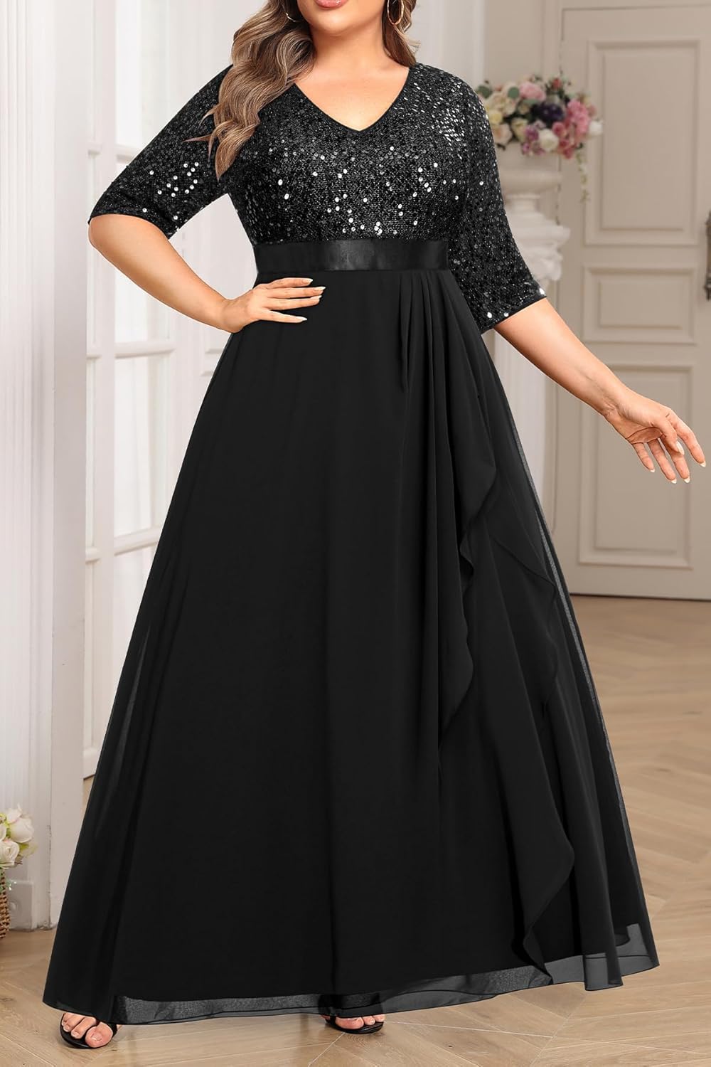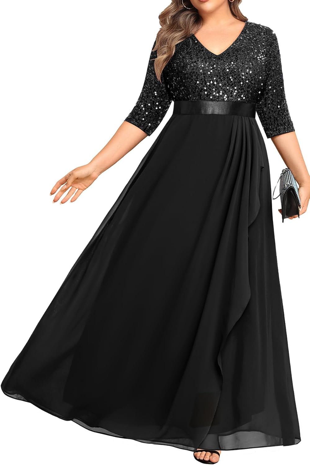- Sequin and chiffon design: This ball gown and evening dress features a V-neck, 3/4 sleeves, and hidden back zipper. It also has an empire waist, which is typical of an A-line long dress. The V-neck modifies the neckline, and the high waist and cascading ruffles design elongate the legs, making the wearer appear taller and slimmer.