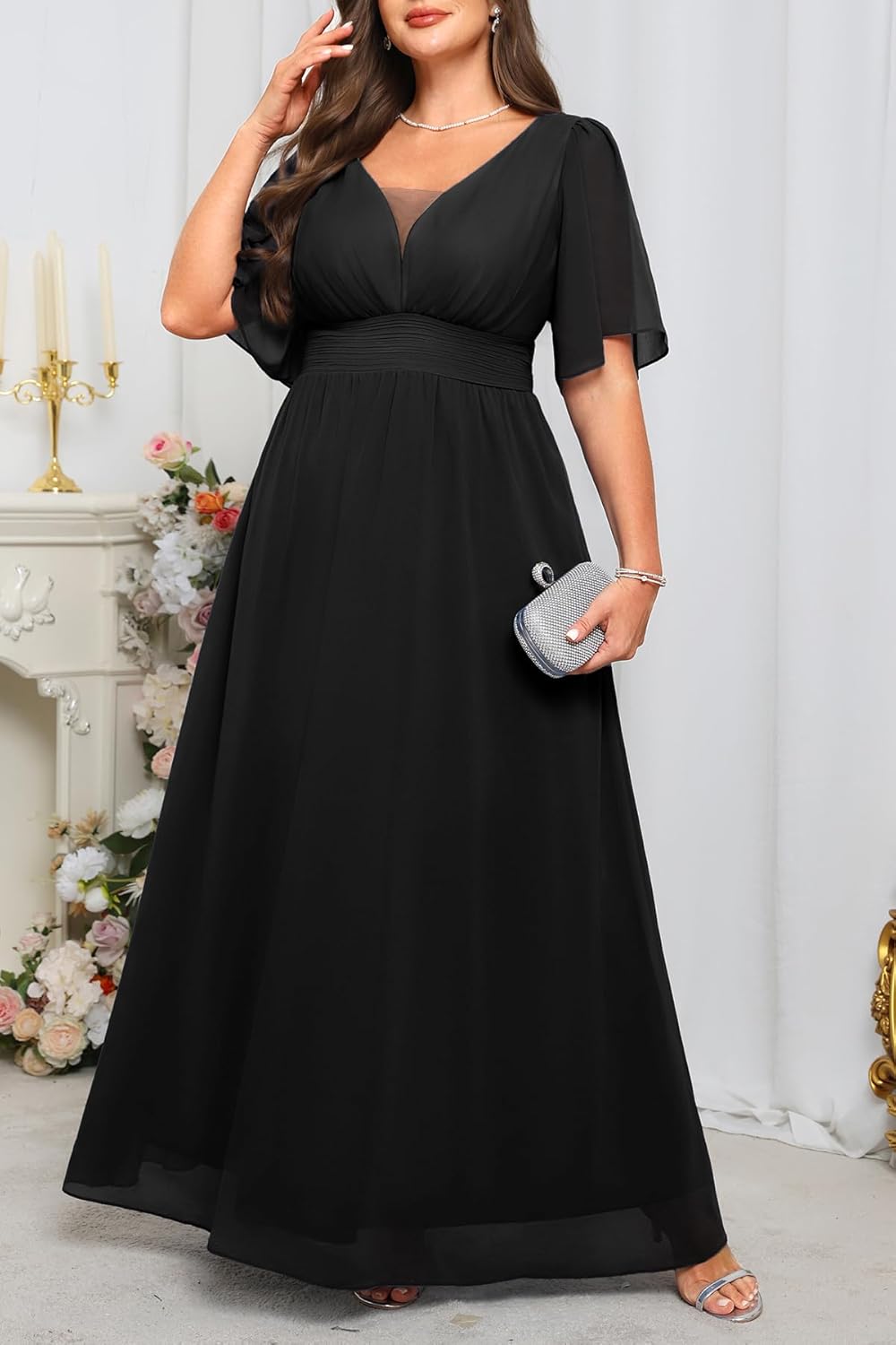 • Elegant Chiffon Evening Gown‌: This A-line formal dress‌ features a flattering V-neckline and V-back‌ with delicate ruffled sleeves. The ‌empire waist‌ elongates your silhouette, while the ‌elasticated back‌ waistband ensures a comfortable fit for all body types. A sheer mesh panel on the chest adds a ‌subtly sexy touch‌, perfect for weddings or cocktail parties.