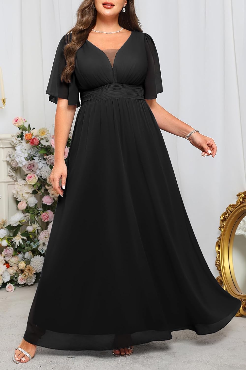 Plus Size Formal Dresses – V Neck Flutter Sleeves Evening Gowns Bridesmaid Wedding Guest Chiffon Long Maxi Dress