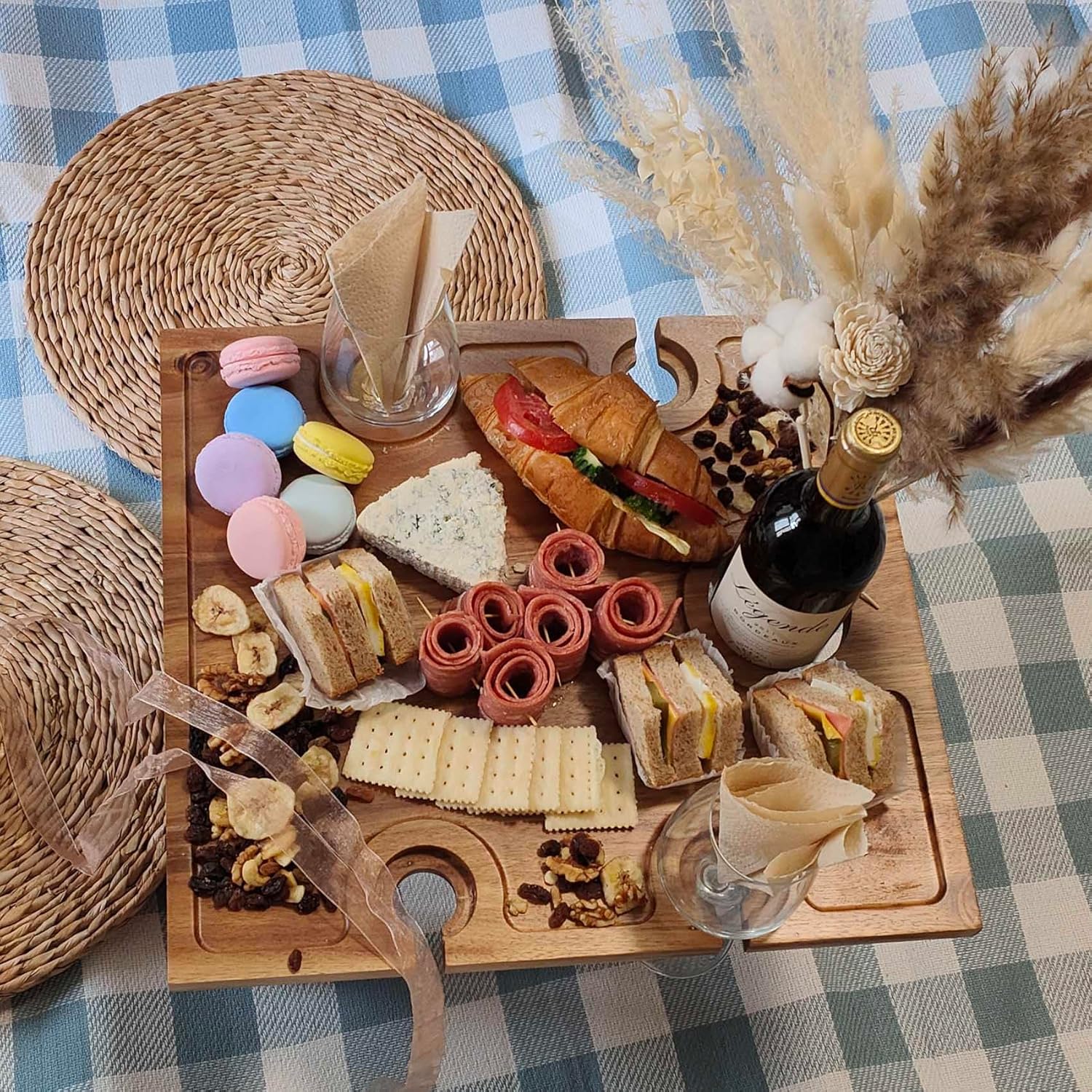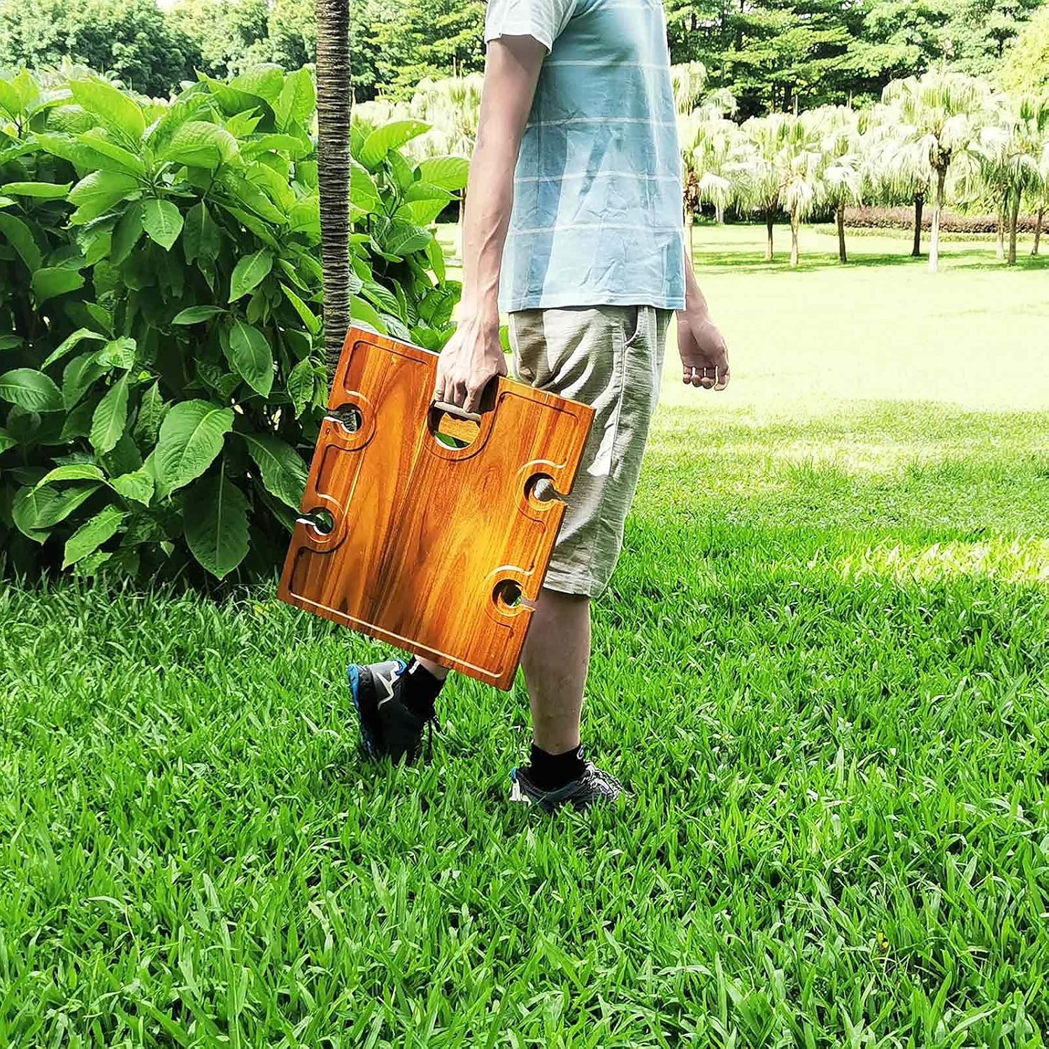 • 【Larger Surface and Thoughtful Details】 Larger board – 17.3″ x 15.7″ (L x W) can hold more food and snack, and up to 4 wine/champagne glasses, beer bottles, soda cans. The tray surface design keeps fruit, nuts or candies from rolling off. The hole for securing wine bottle can also be used as a handle, facilitating you to take it to anywhere.