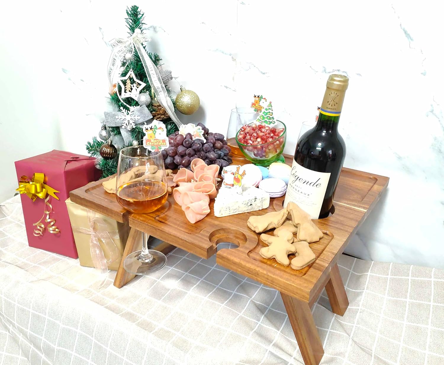 Portable Wine Picnic Table, Acacia Wood, Larger Tray Foldable, Charcuterie Board, Wine Gift, Decor for Romantic Camping, Engagement Party, Concerts, Glamping, Winter Adventure