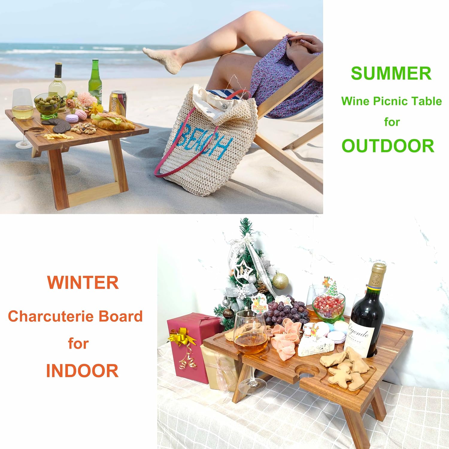 • 【Natural & Sturdy】This rectangular picnic table is made of Acacia Wood, known for its durability, suitable for any surface. This folding wine table is coated with a food-grade protective oil. It is also a perfect charcuterie board and low table for breakfast on bed. On summer it’s used outdoor, while indoor on spring and winter. Unique gifts for wine lovers and enthusiasts.
