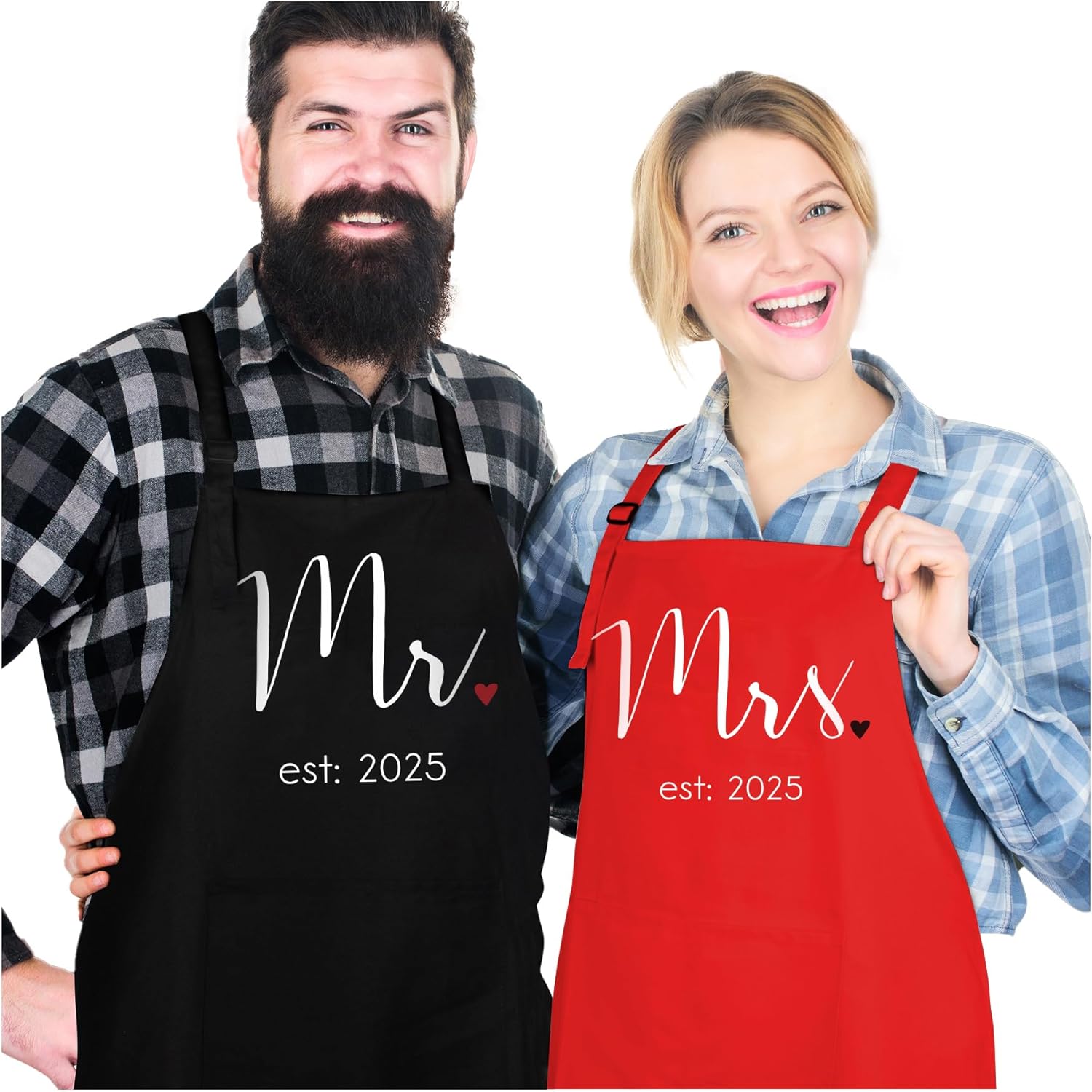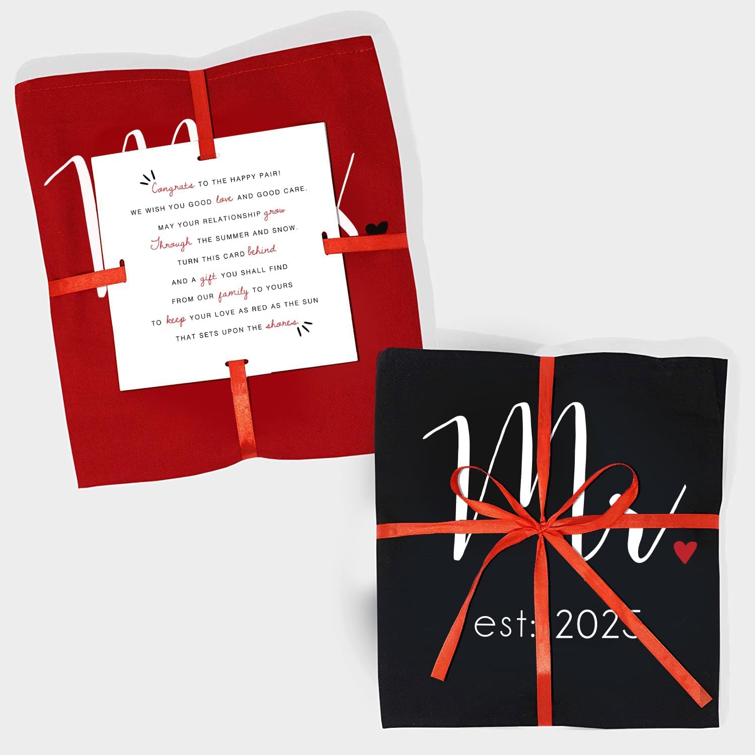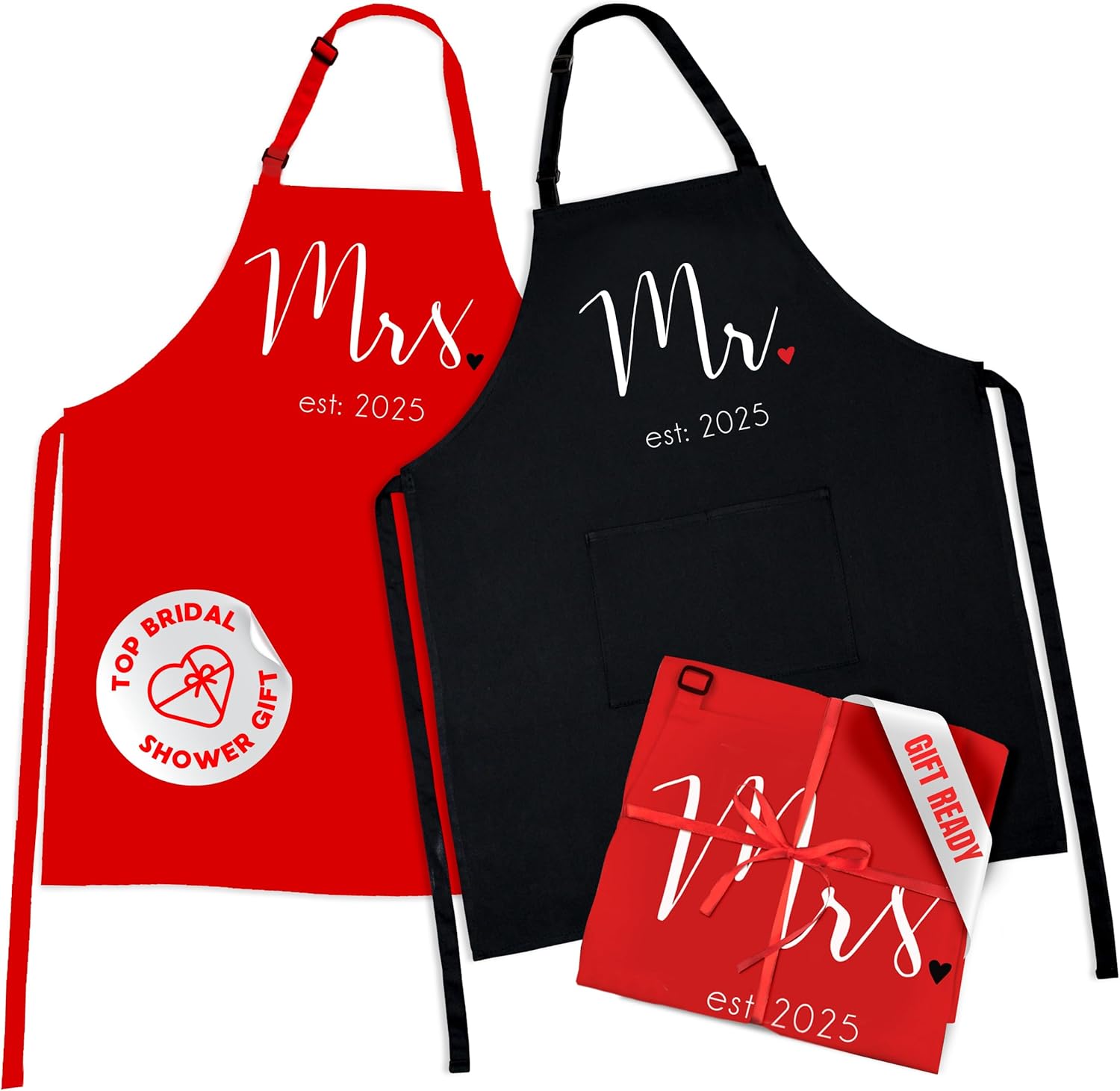 - GIFT READY & HASSLE FREE – We do the work so you don’t have to! Each apron set comes gift-ready, neatly folded, wrapped with a romantic red ribbon along with a special congratulatory message for the happy couple.