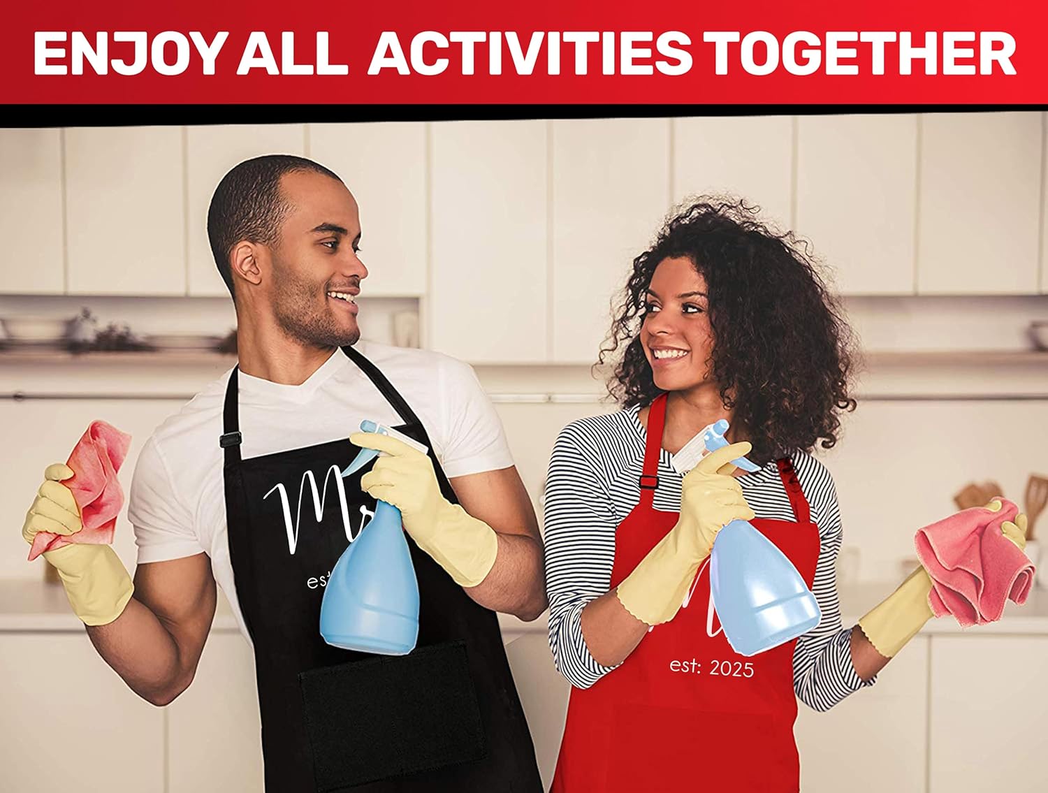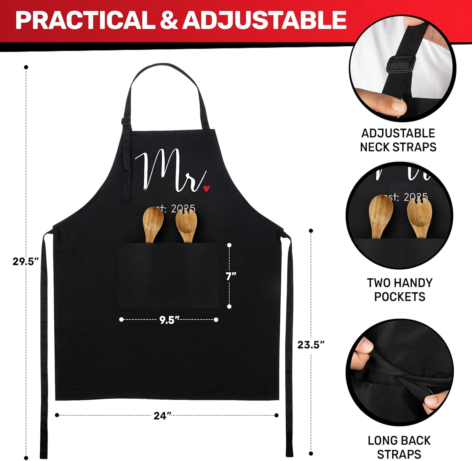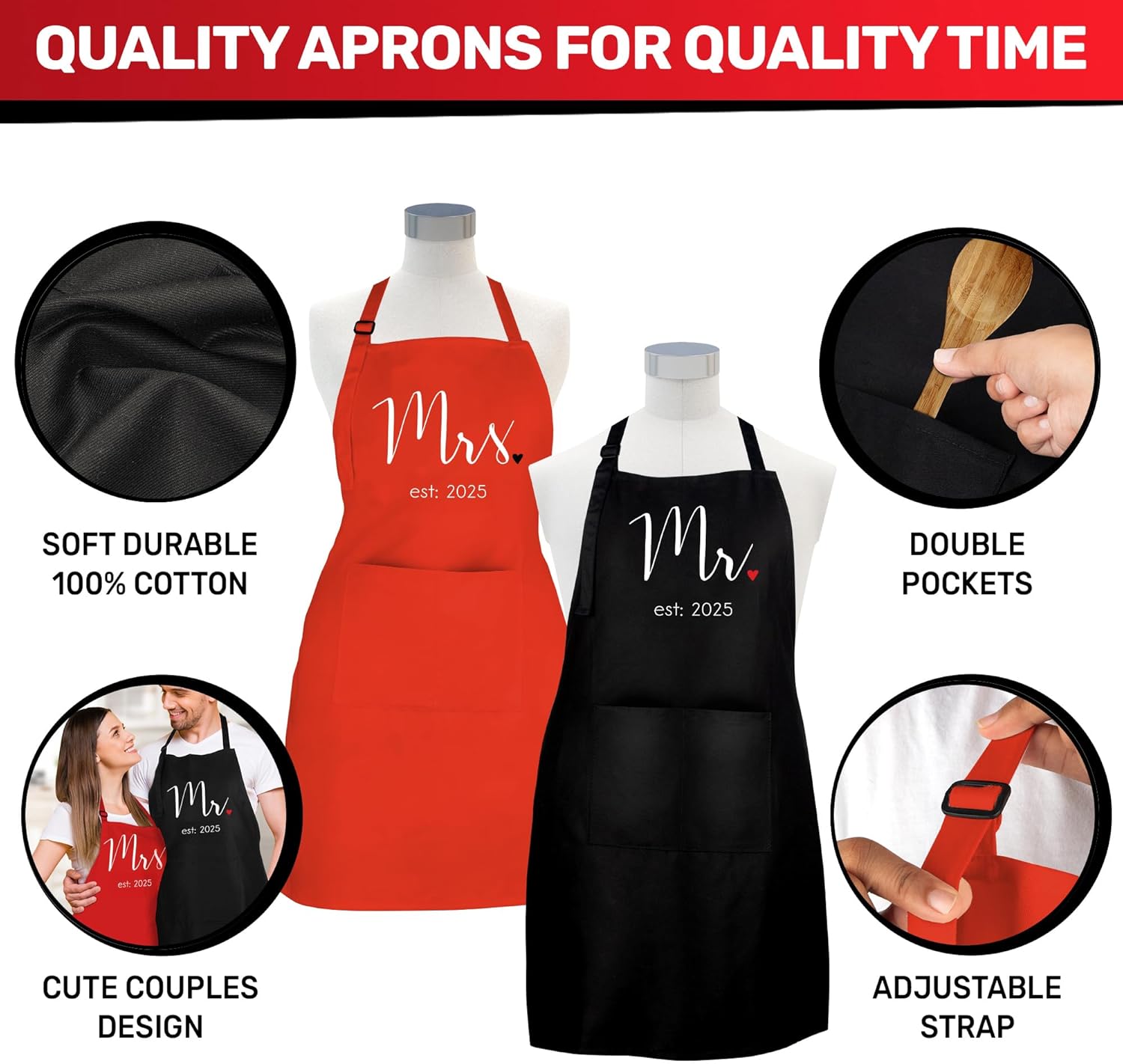 - GIFT READY & HASSLE FREE – We do the work so you don’t have to! Each apron set comes gift-ready, neatly folded, wrapped with a romantic red ribbon along with a special congratulatory message for the happy couple.