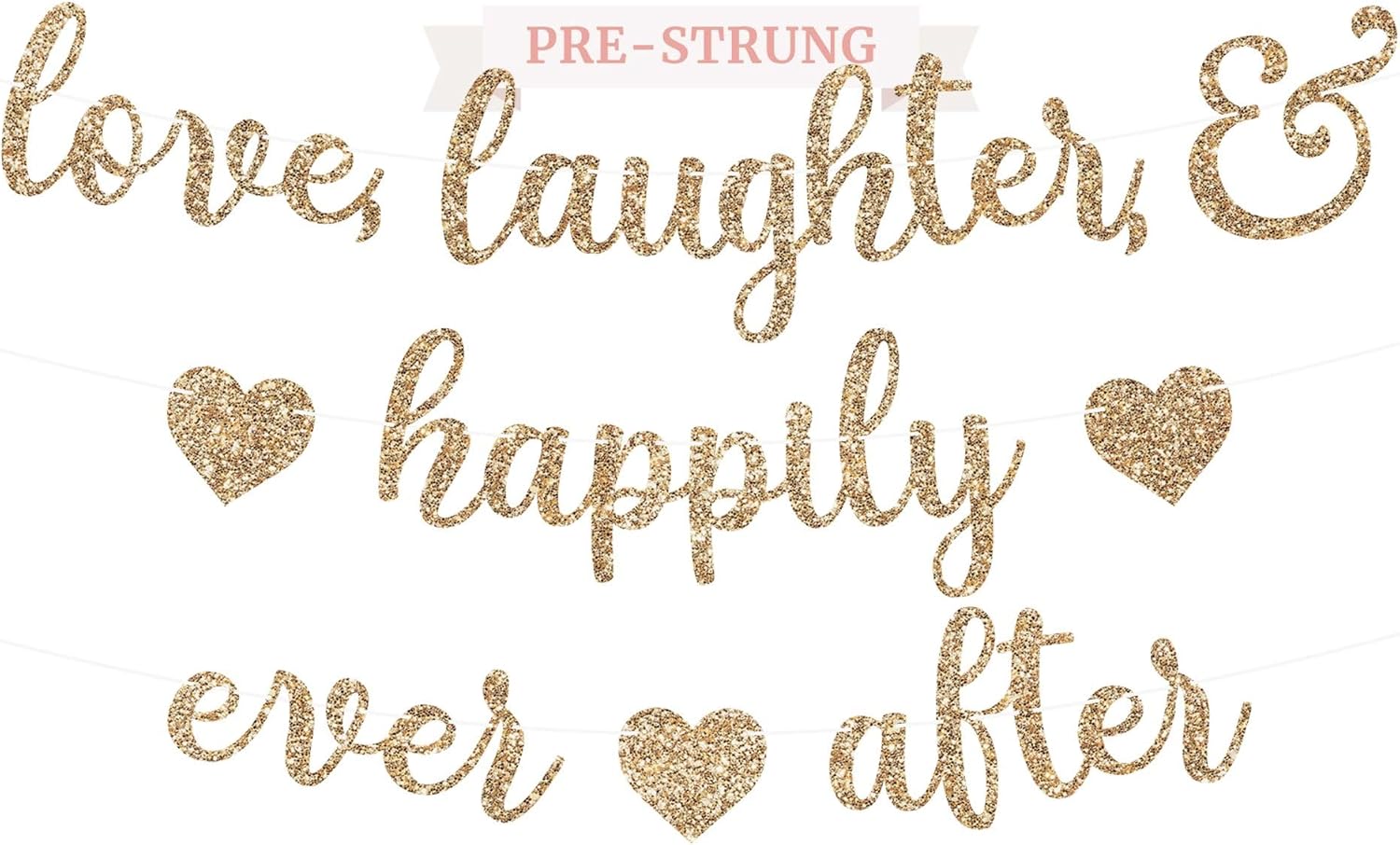 - 🩷 PRE-STRUNG = NO WASTED TIME PUTTING THEM TOGETHER – Unlike others, our gold love laughter & happily ever after banner will arrive to you with each letter already pre-strung on a 8 ft strand. No DIY required! All you have to do is hang and you’re ready to go.