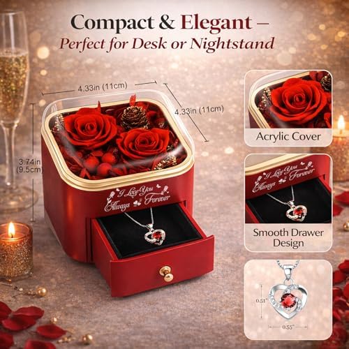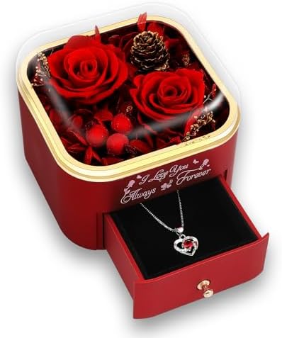 Preserved Rose Gift Box with Necklace, Valentines Day Gift for Her, Meaningful Keepsake for Wife, Girlfriend or Mom, Anniversary & Birthday Gift