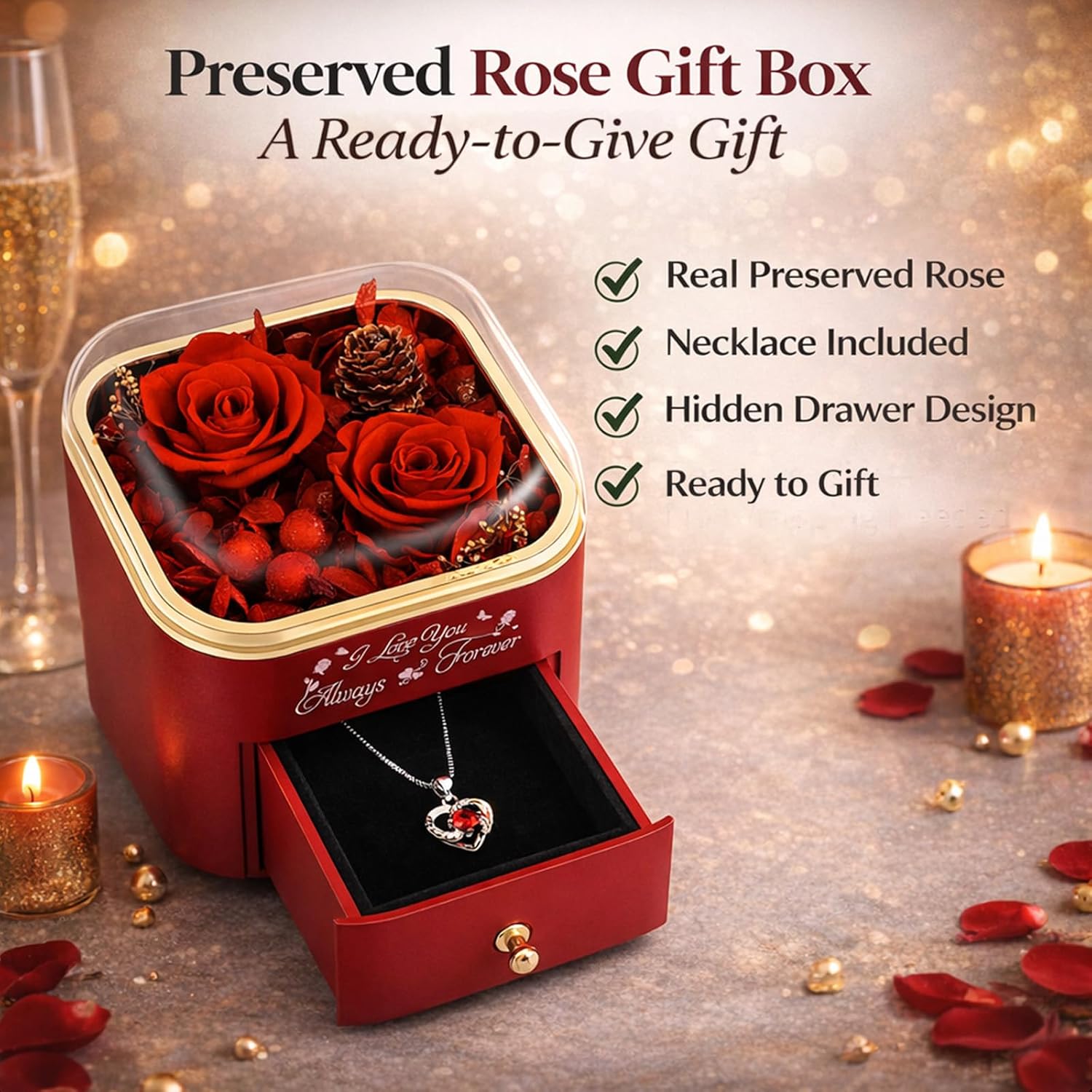 • A Gift That Speaks When Words Aren’t Enough – Sometimes “I love you” deserves more than words. This preserved rose gift box with a hidden necklace gift surprise is designed to express love, gratitude, and appreciation in a meaningful way.
