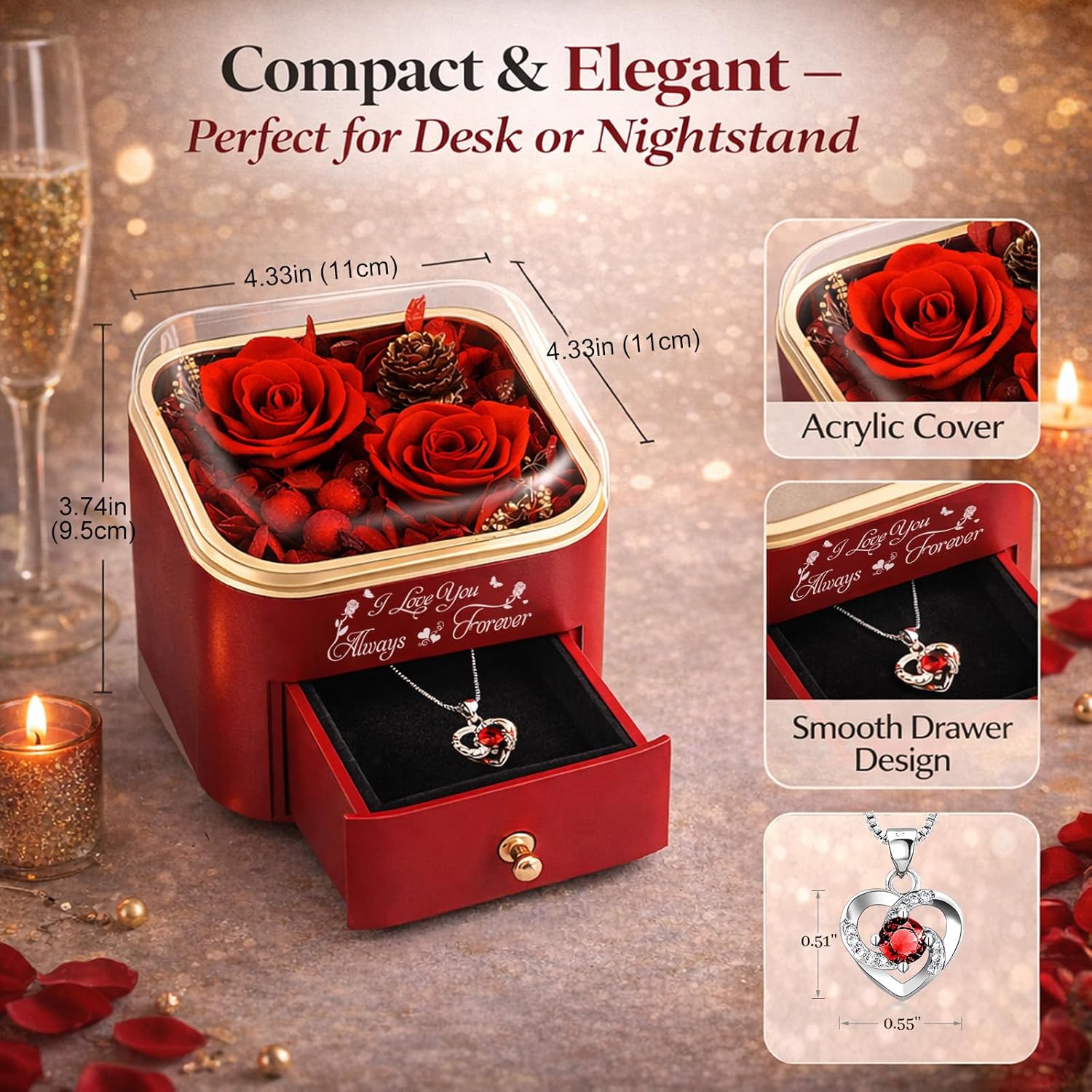 • A Hidden Necklace Surprise Inside – Tucked discreetly inside the drawer is a delicate necklace, creating a moment of surprise she won’t expect. It’s more than a gift — it’s an unforgettable experience.
