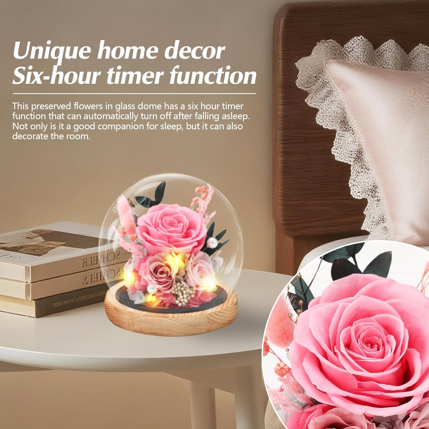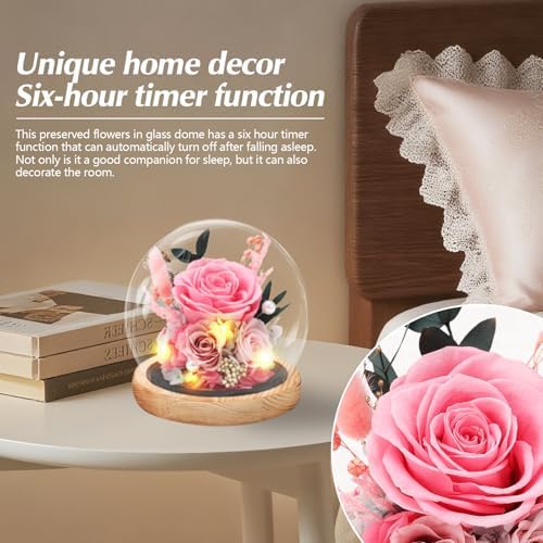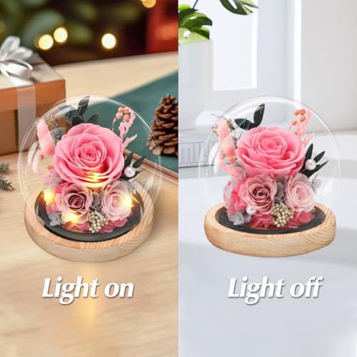 • Light-Up Preserved Rose in Glass Dome – Romantic Gift for Her: Our pink preserved rose features 20 built-in LED lights at the base (powered by 3 AAA batteries, not included). When lit, it casts a soft, romantic glow that adds warmth to any space. Built-in timer without setting, simply flip the “ON” switch, and the lights will 6-hour on/18-hour off automatically