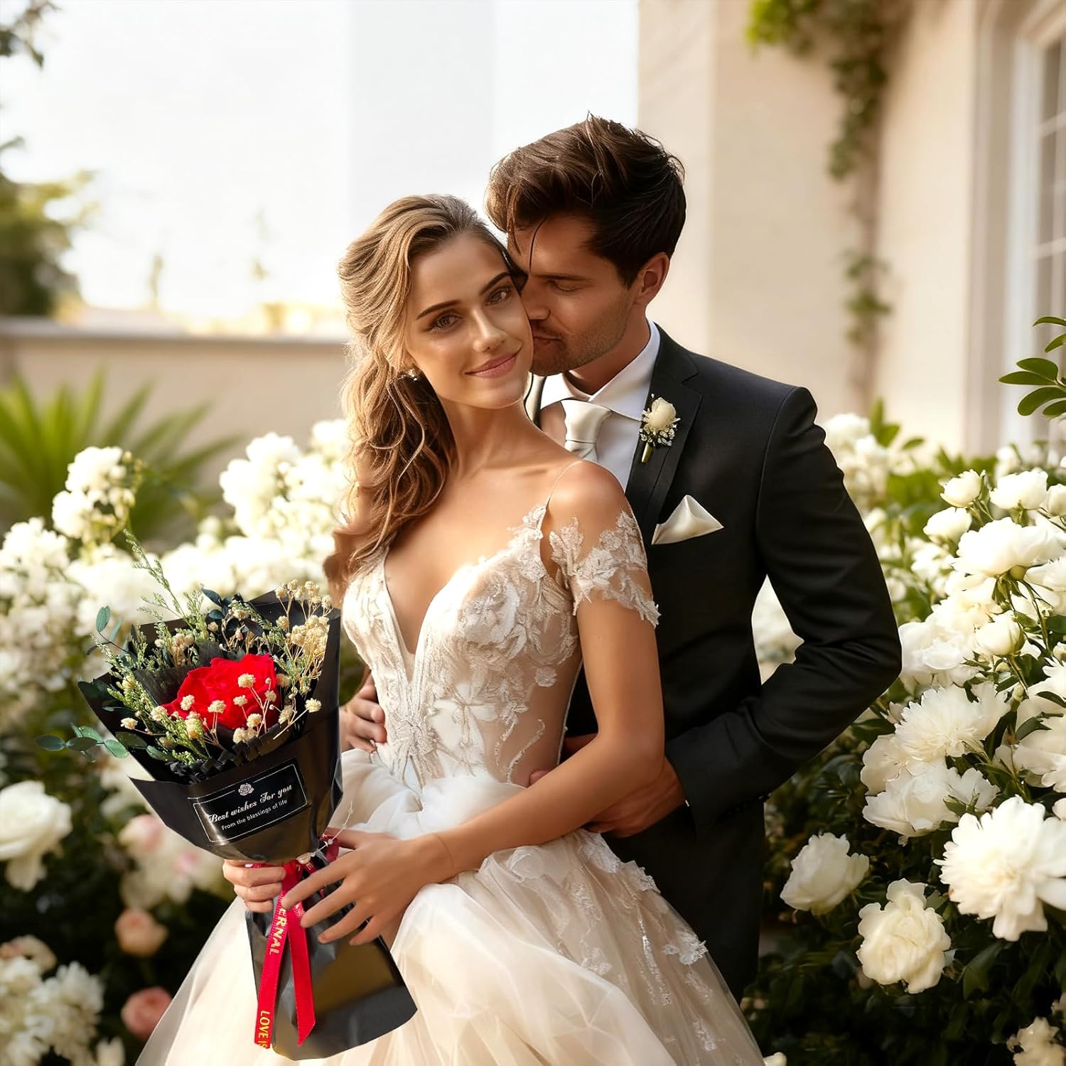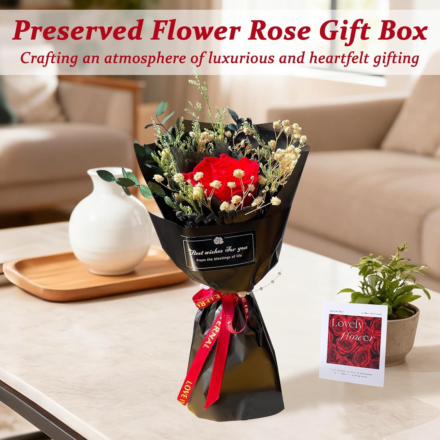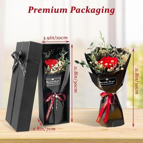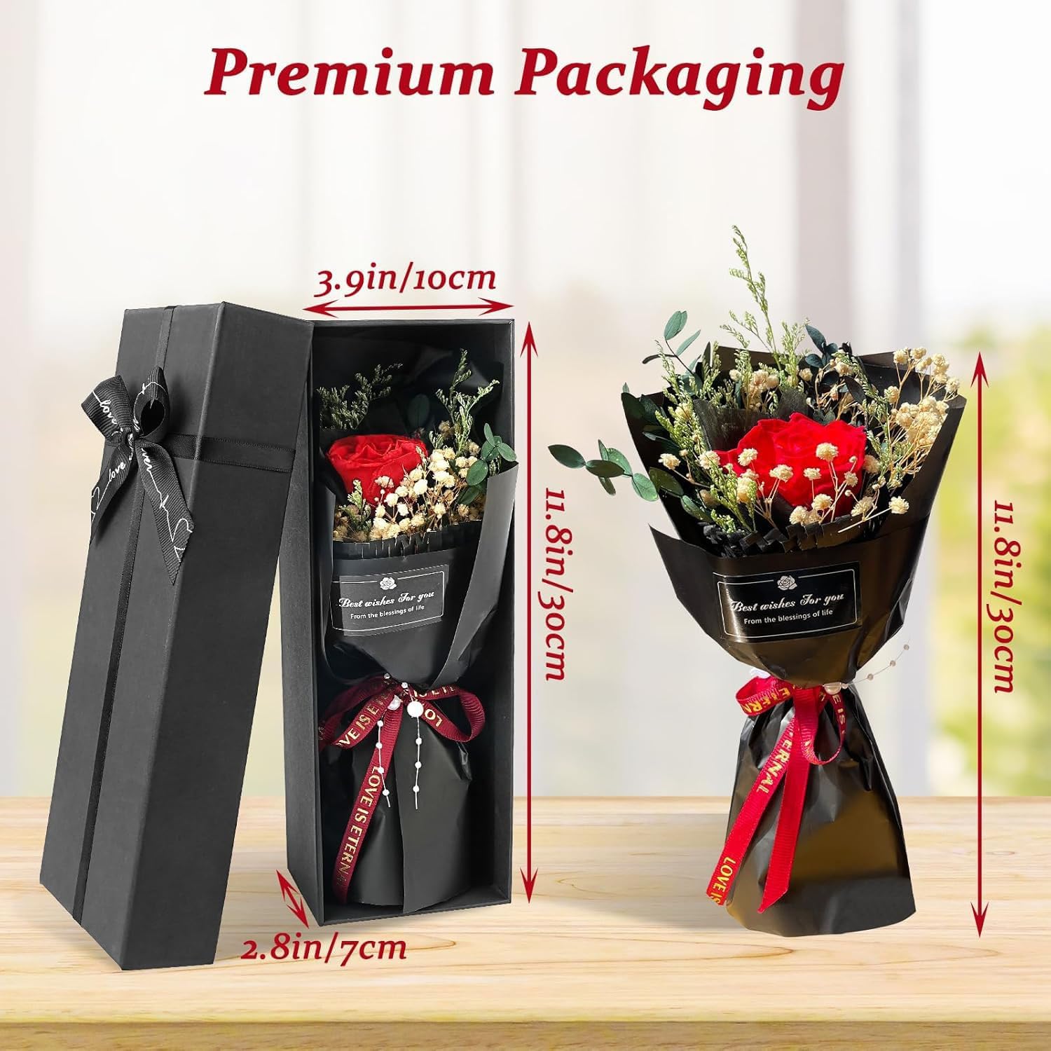 • 【Premium Black Gift Box】Elegantly wrapped in black art paper and accented with a red satin ribbon, the rose comes in a sleek black gift box, exuding luxury and ready for gifting on special occasions. Eternal red rose bouquet in a sleek gift box combines elegant design with timeless beauty, making it the ultimate symbol of love.
