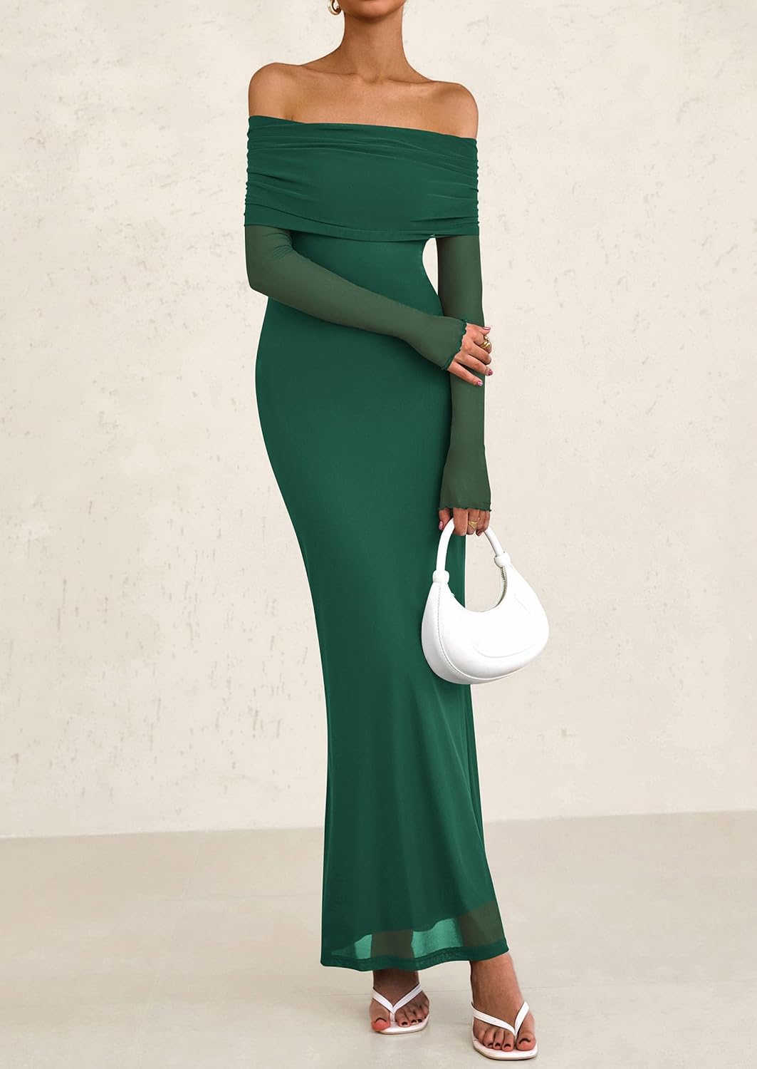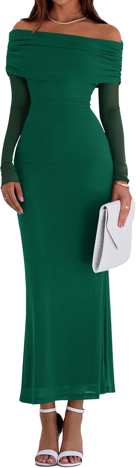 • Eye Catching Designs:Birthday Party Dress Features A Flattering Off The Shoulder Neckline,Ruched Detailing.Bodycon Maxi Dress,Womens Ruched Dress,Fitted Dress With Sheer Sleeves That Artfully Reveal Your Arms’Silhouette Blending Allure And Sophistication