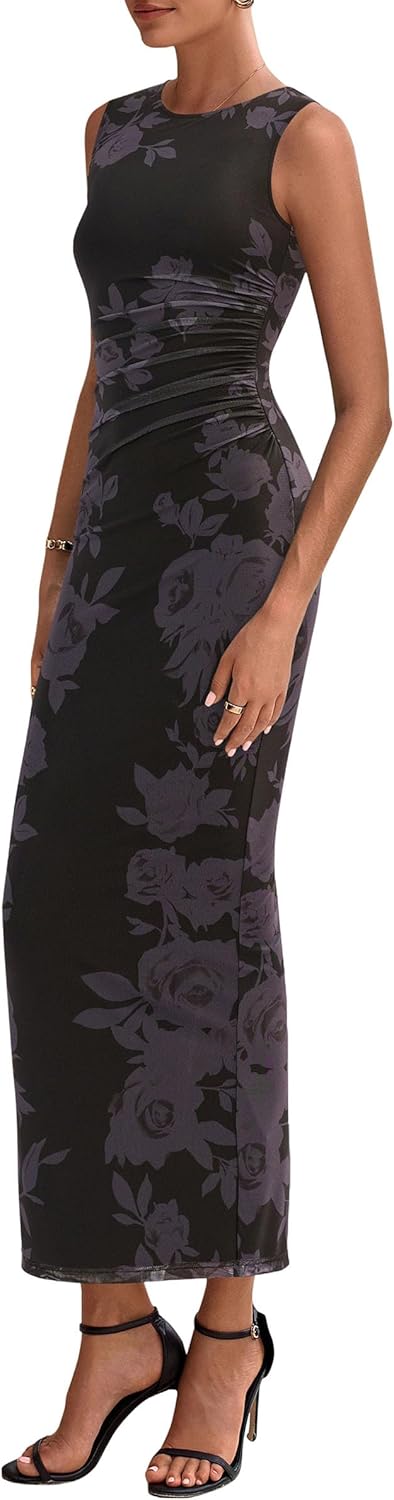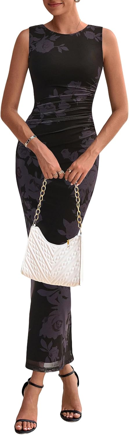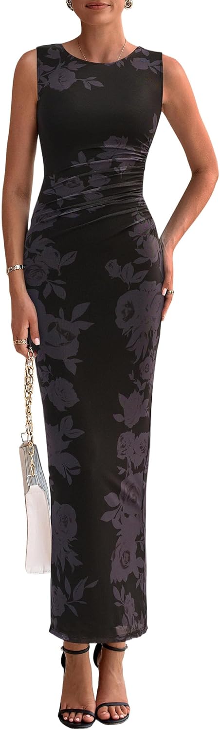 - Features: Sleeveless, ruched detail, floral Print, mesh fabric, maxi length, slim fit, sexy style, bodycon lightweight dresses for women, providing a stunning look that’s both comfortable and soft to the touch