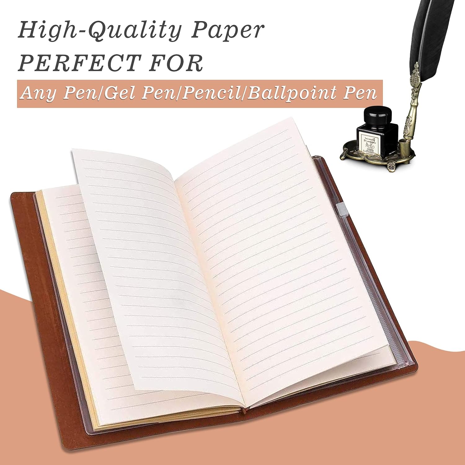 - High-Quality Leather Journal: The journal notebook has the right size 7.9 “x 4.7”, leather material, retro appearance, smooth touch, 140 pages of refillable paper including a mobile phone slot, and card slot.