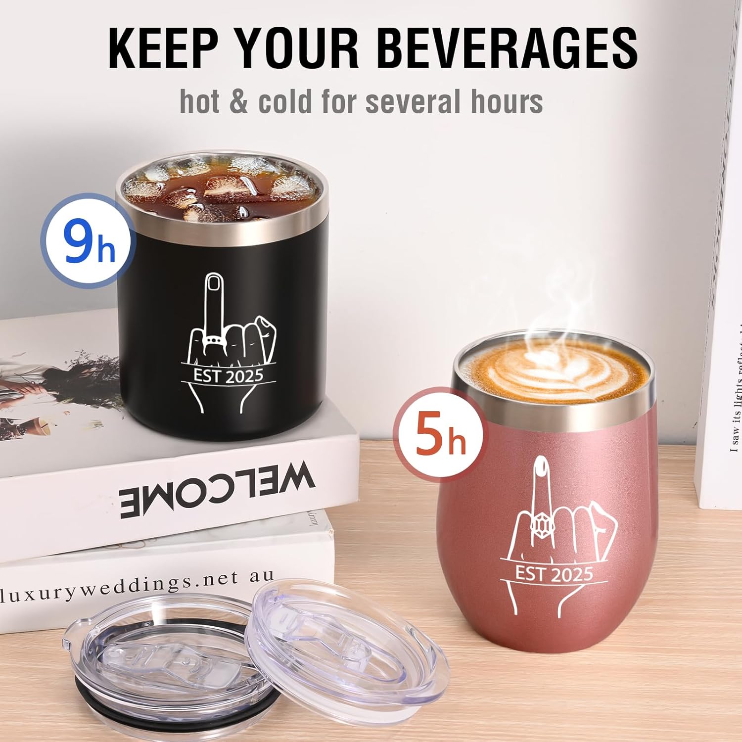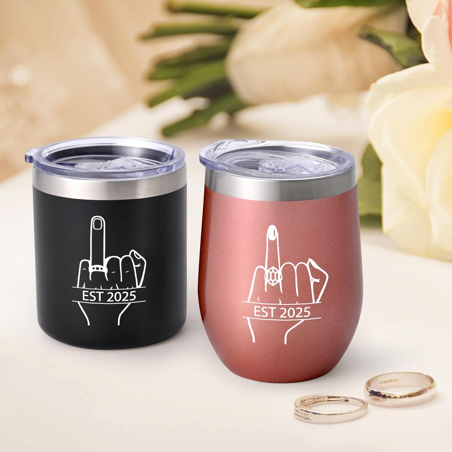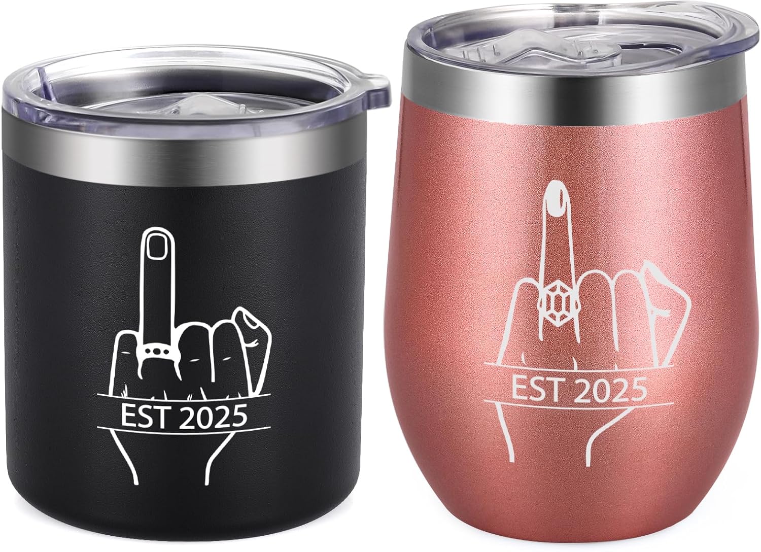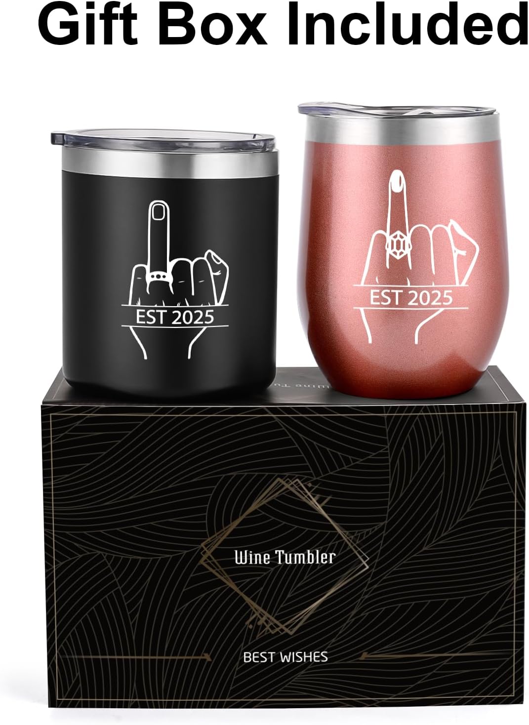 - UNIQUE DESIGN: The tumbler set consists of a black whiskey tumbler and a white wine tumbler, each of which is printed with a finger for wearing the special meaning ring with EST 2025-recording the happiness of this moment.
