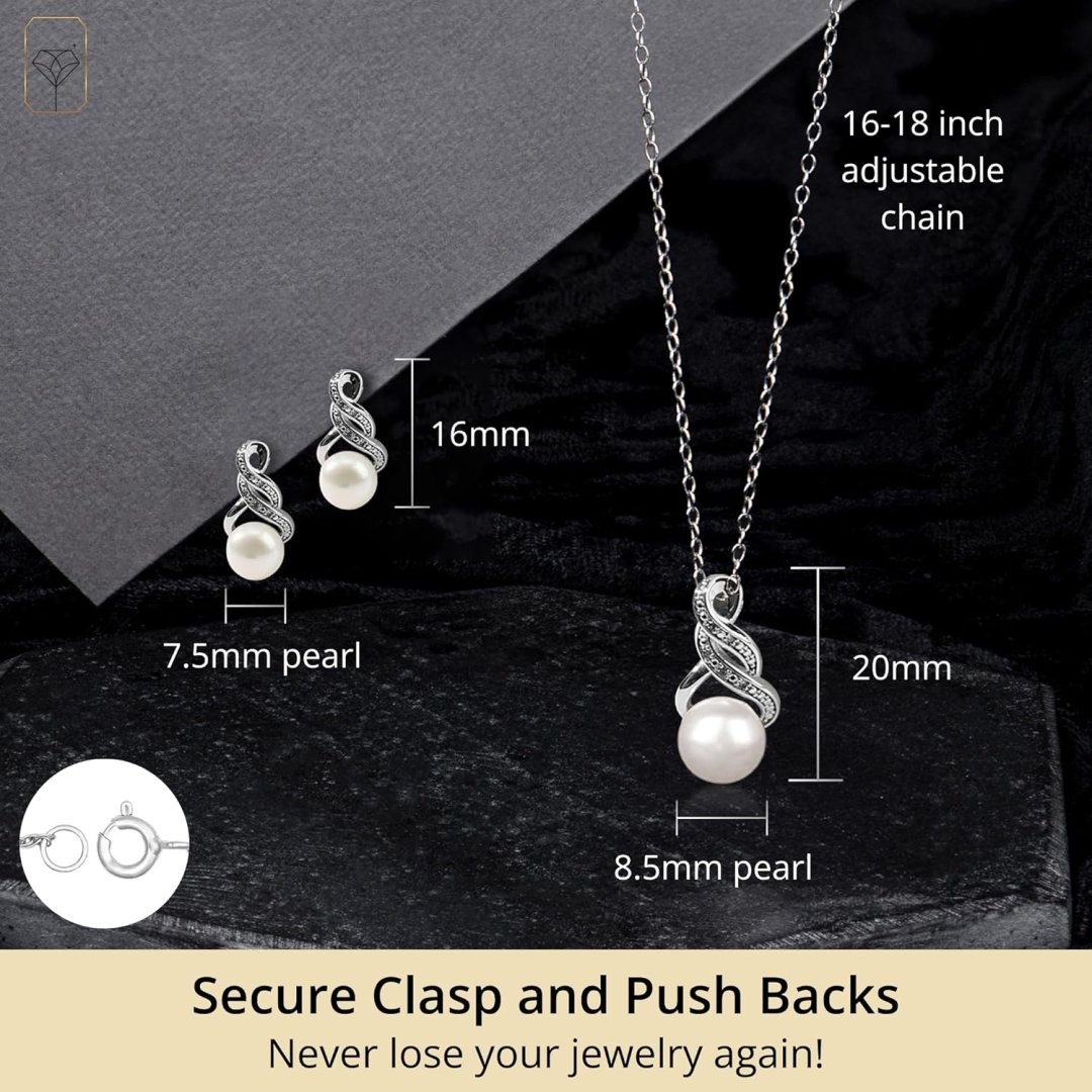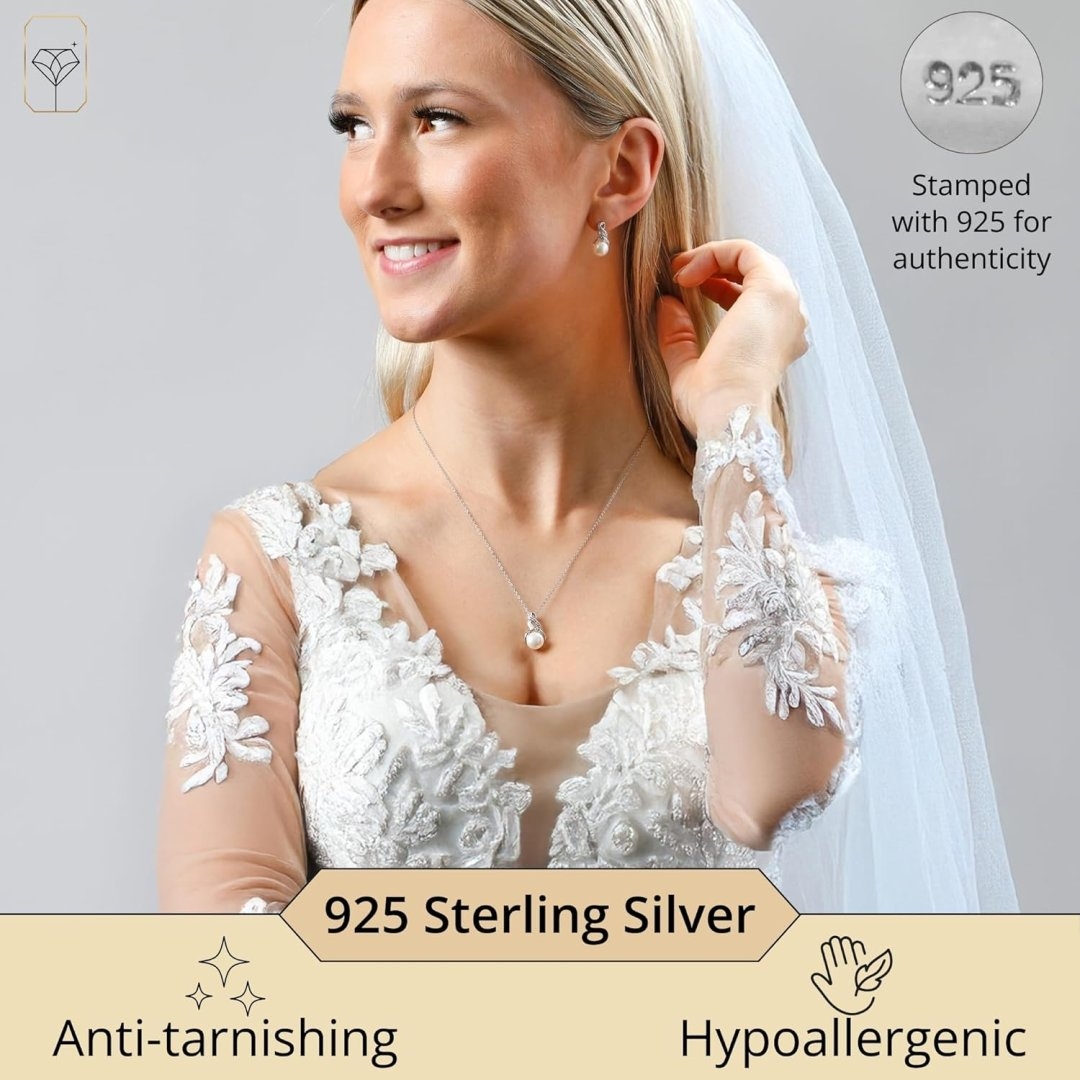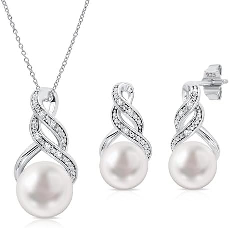 - Silver Jewelry Set – Our necklace earring sets for women are made with 925 sterling silver and stamped with “925” to ensure authenticity. Silver pearl necklace and earring sets for women have an 18 inch rope chain and the pearl and diamond earrings have push backs