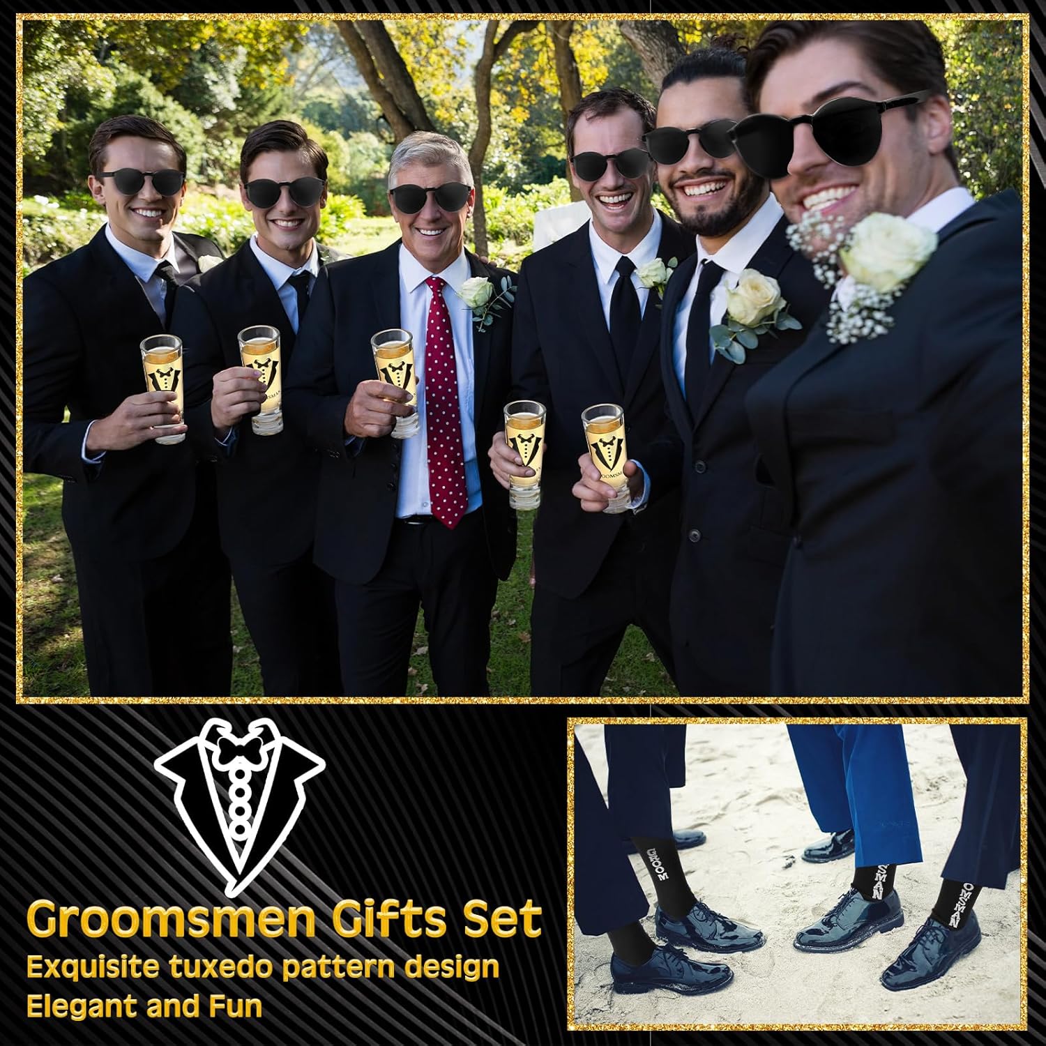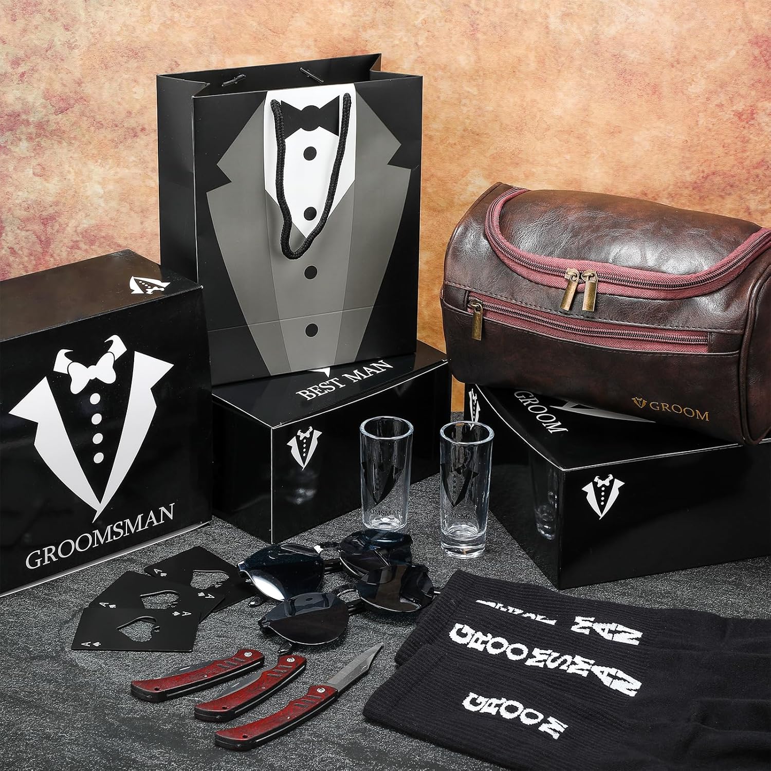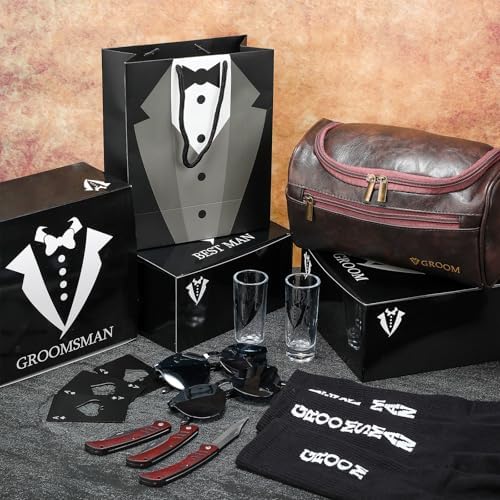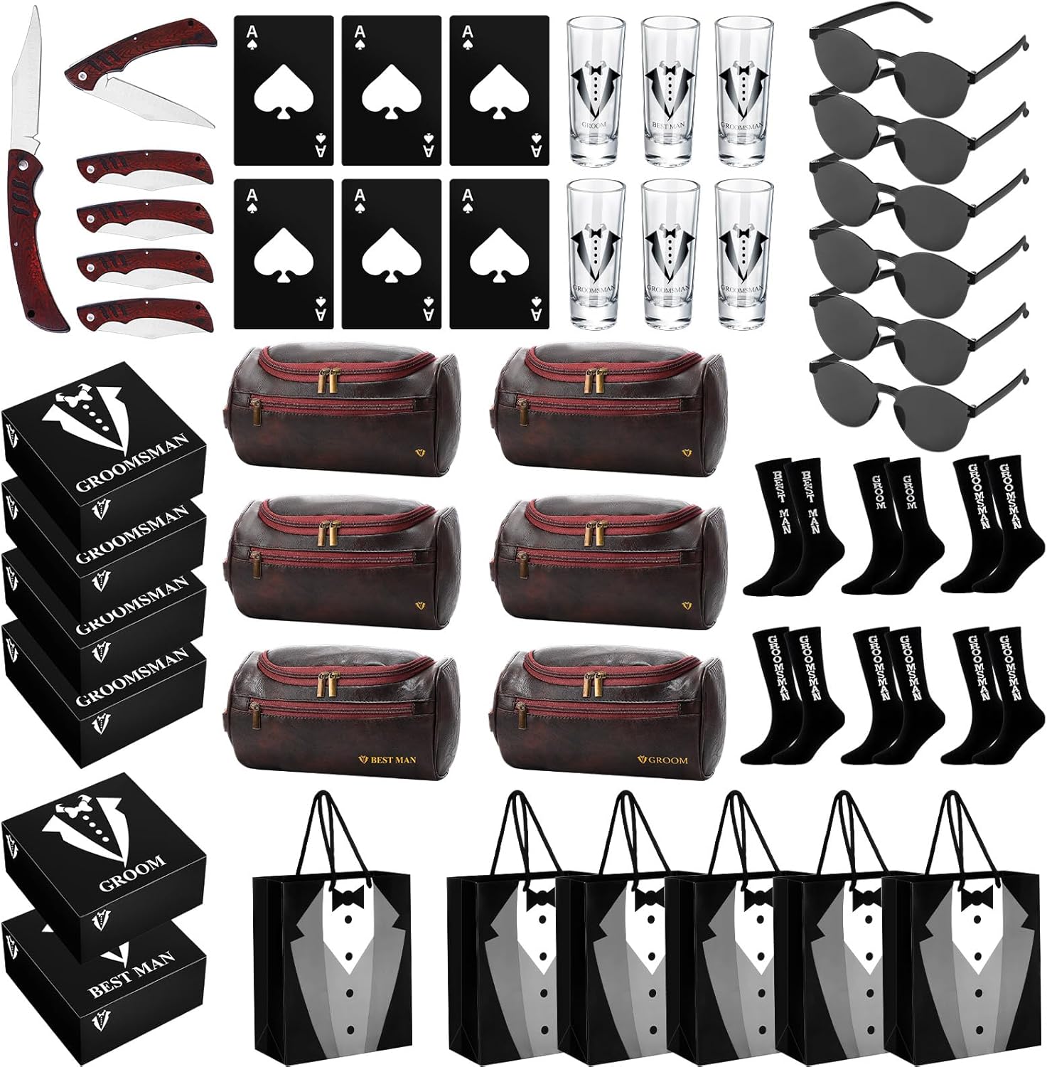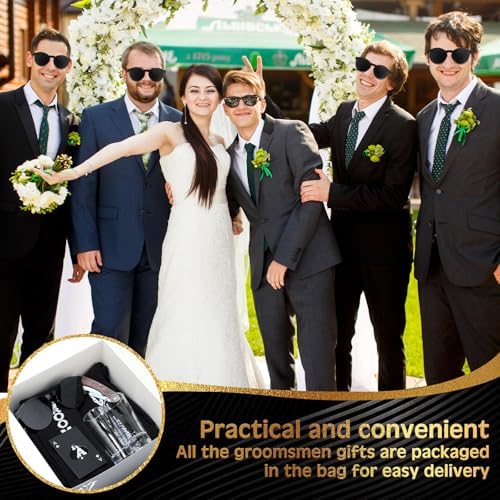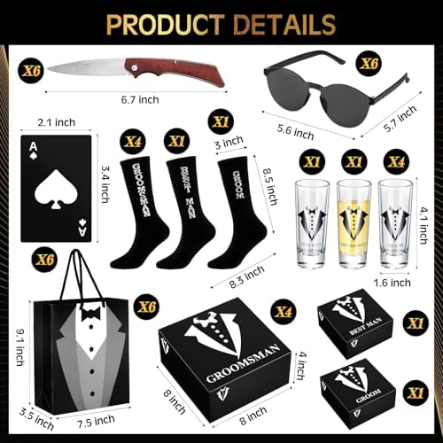 - Complete and Thoughtful Gift Set: Package includes groomsmen proposal gift set of 6 of 8 kinds, which includes 6 groomsmen proposal boxes, 6 shot glasses, 6 sunglasses, 6 PU leather toiletry bags, 6 wood folding knives, 6 pieces of poker card bottle opener, 6 pieces of groomsmen bags, 6 pairs of socks, enough quantity and nice combinations are suitable for preparing gift to groomsmen and groom, each item in the set combines elegance with practicality
