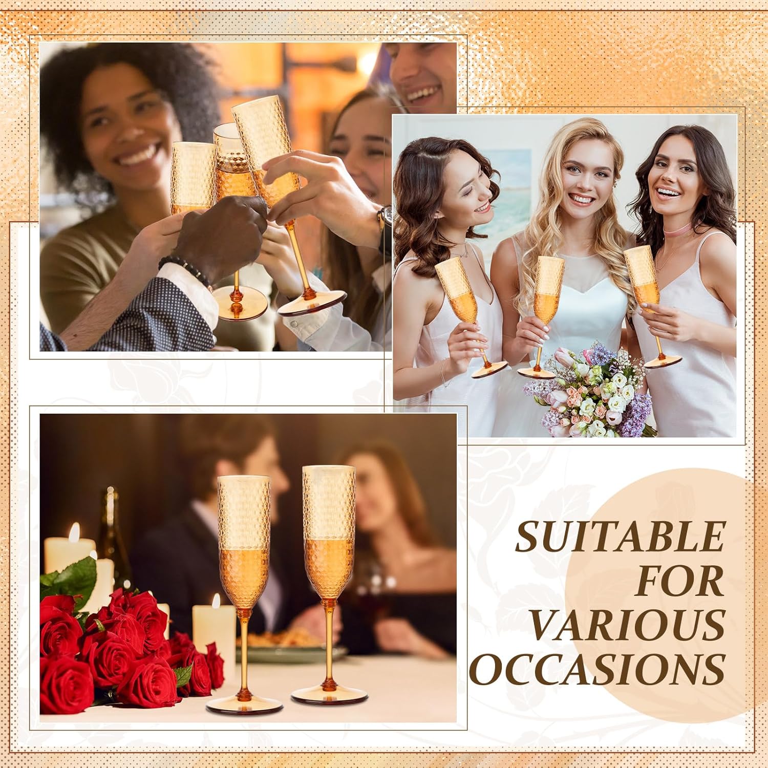 • Elegant Diamond Pattern: these plastic champagne glasses feature an exquisite diamond-cut design, combining vintage charm with modern sophistication, adding a touch of vintage elegance to weddings, romantic dinners, and special occasions, turning ordinary moments into unforgettable experiences