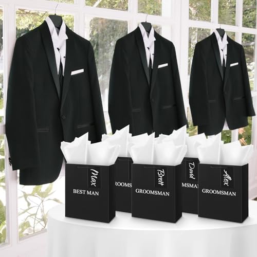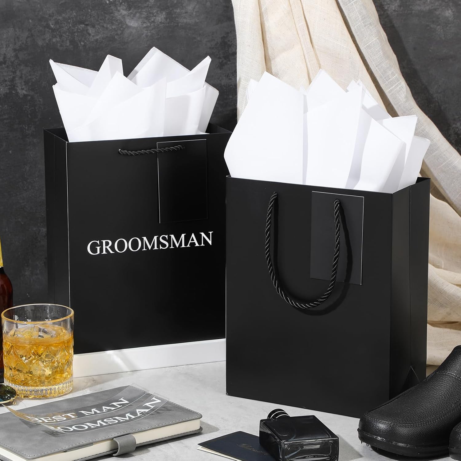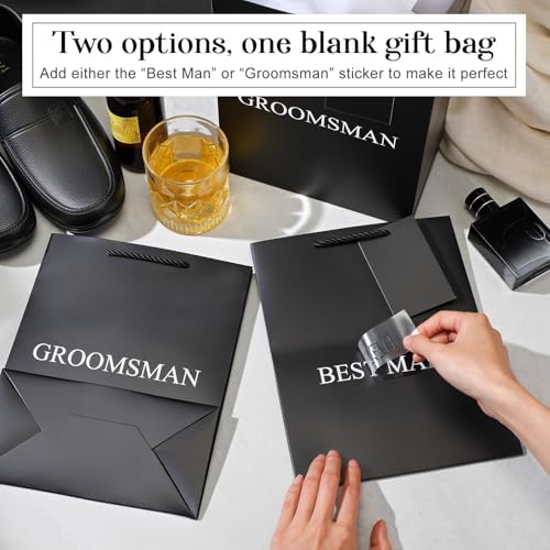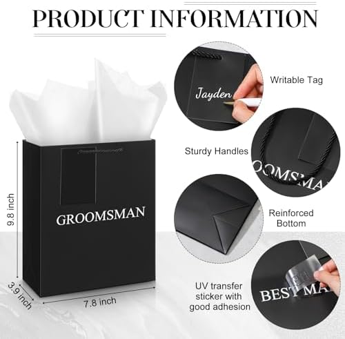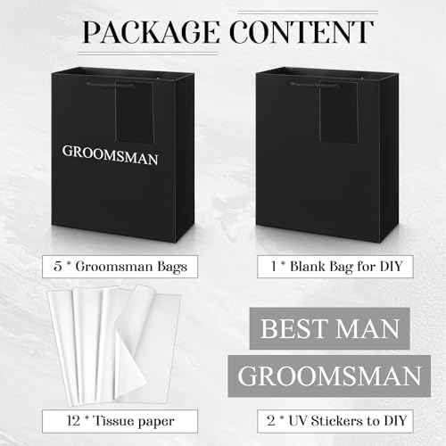 - Package Includes: you will receive 6 groomsman gift bags with blank hang tags and 12 sheets of white tissue paper; Five of the gift bags are printed with “GROOMSMAN” on both sides, and the other is a blank gift bag that can be paired with heat transfer stickers in two styles: “GROOMSMAN” and “BEST MAN