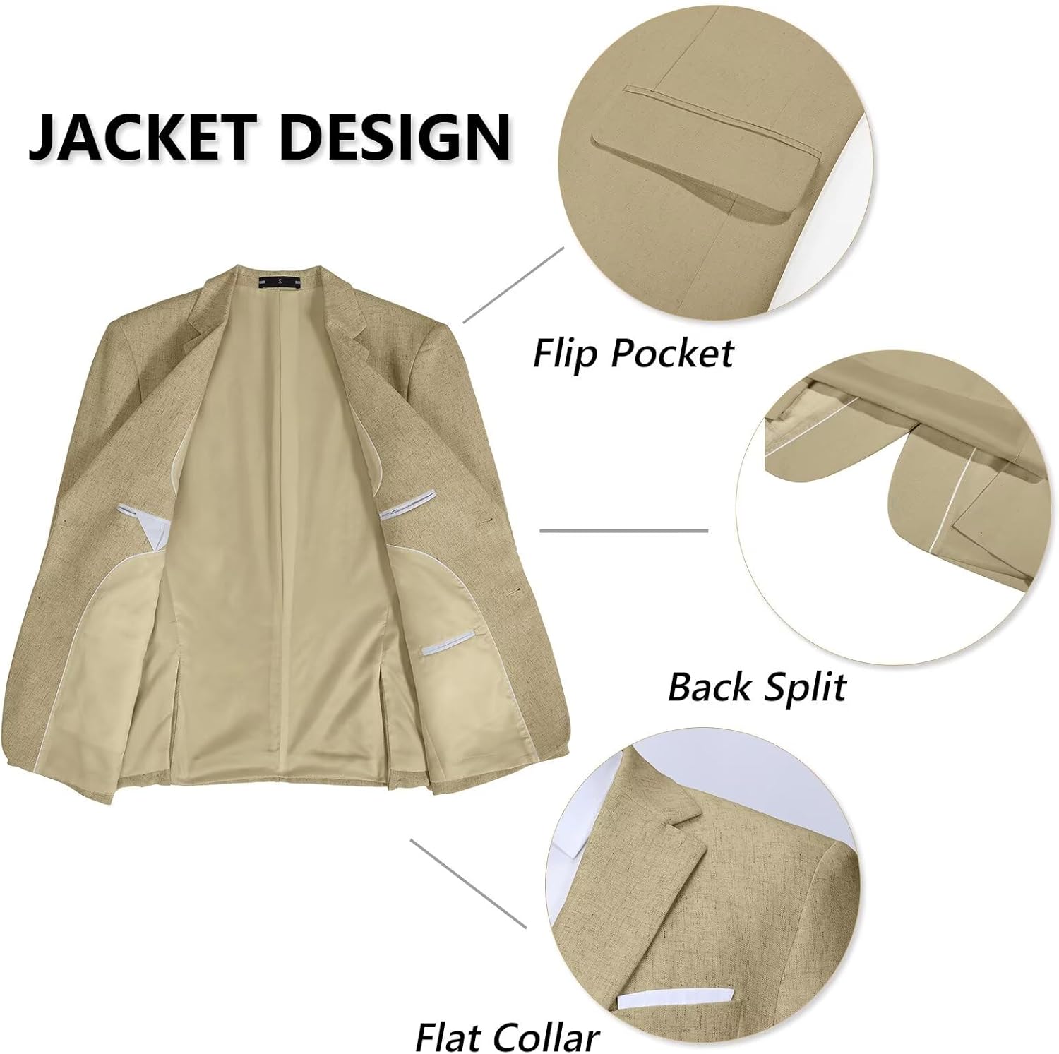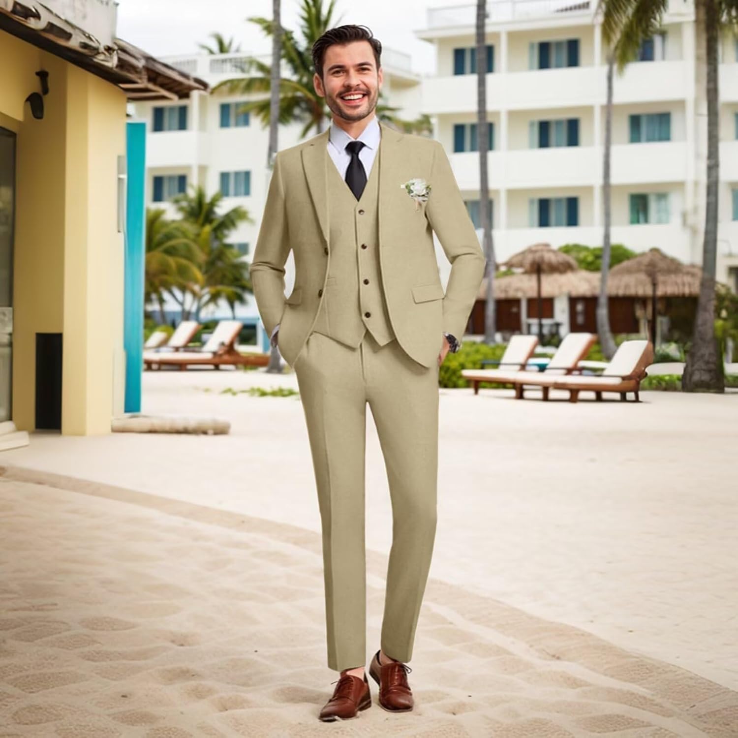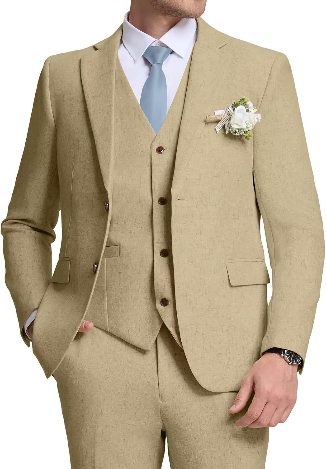 - Classic 3-Piece Linen Suit : Single-breasted jacket with notched lapel, two front flap pockets,and one inside pocket;Double vents at the back for added comfort and style; Men’s dress trousers designed with a zipper fly, adjustable waist tabs, and two genuine rear pockets.
