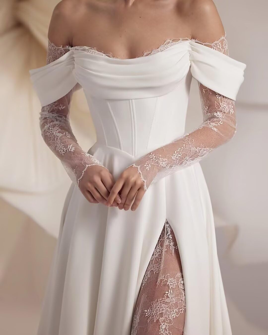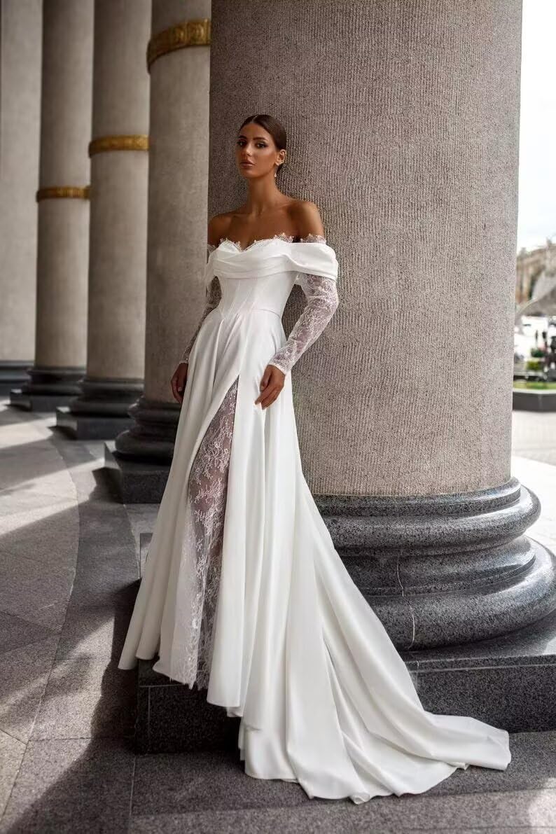 - Feature: Satin lace wedding dresses for bride,cowl neckline,off the shoulder,long sleeves,high slit,split,lace,a line,empire waist,corset top, floor length, lace up back,built-in bra