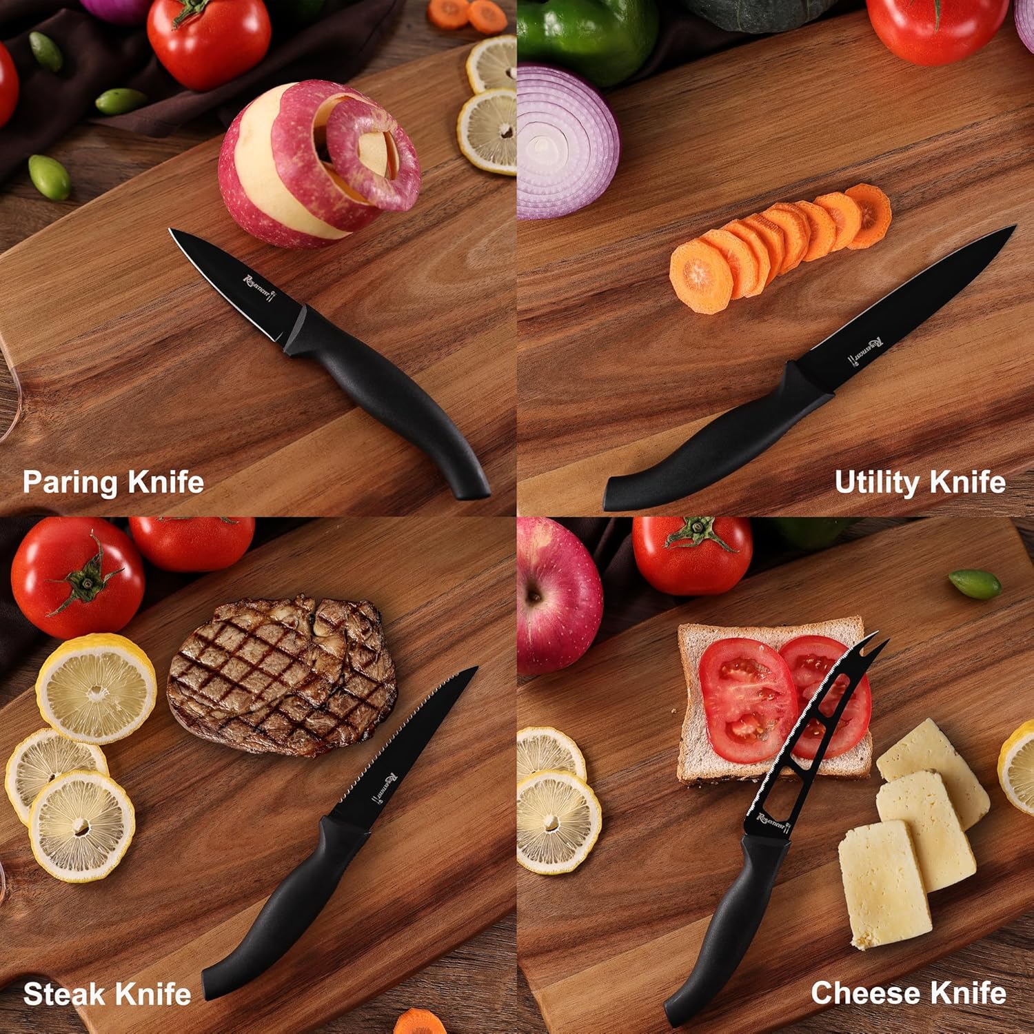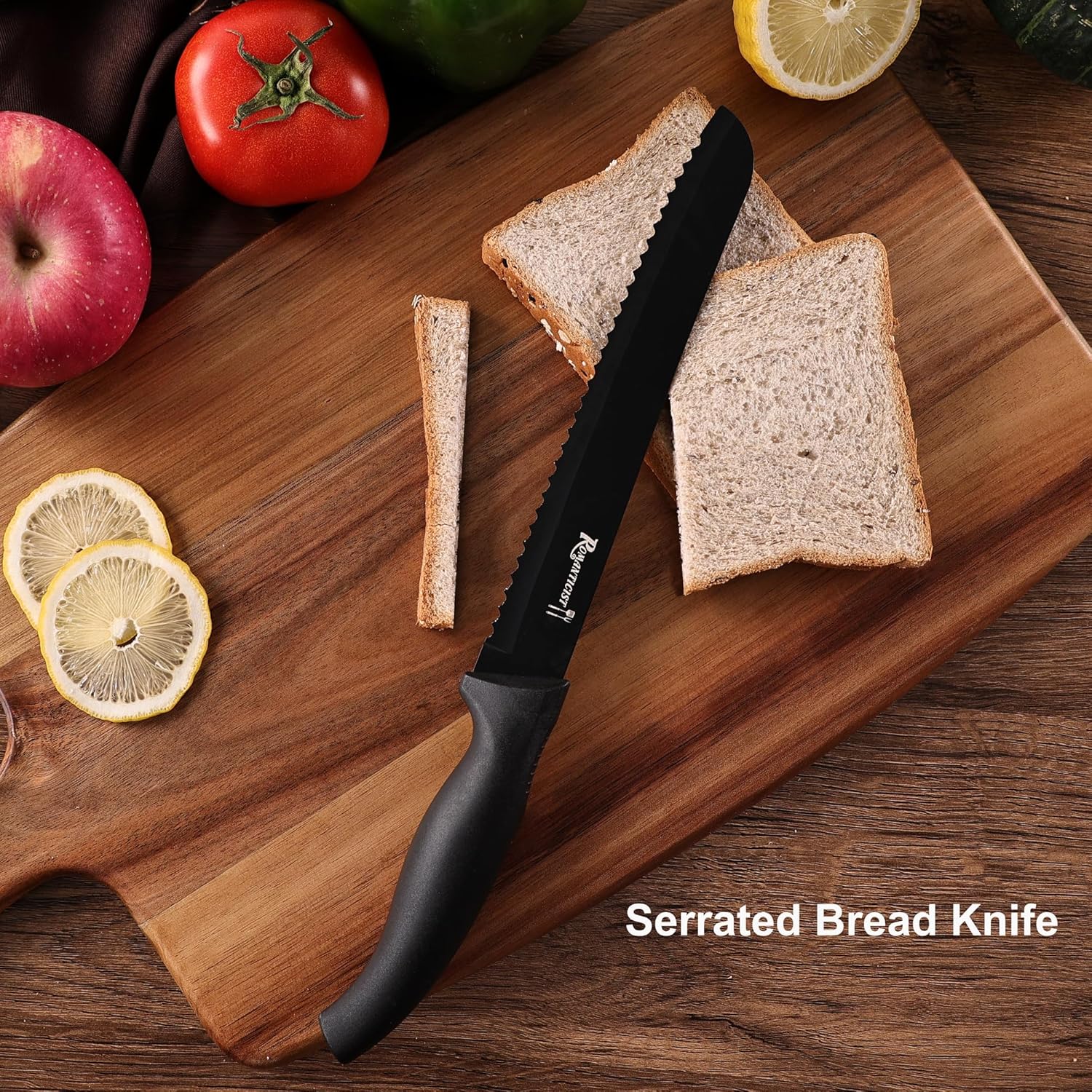 • Non-Stick and Rust-Resistant: Each cooking knives feature a black coating that prevents food from sticking and protects the steel from oxidation; This makes cleaning a breeze and ensures long-lasting durability, even with frequent use